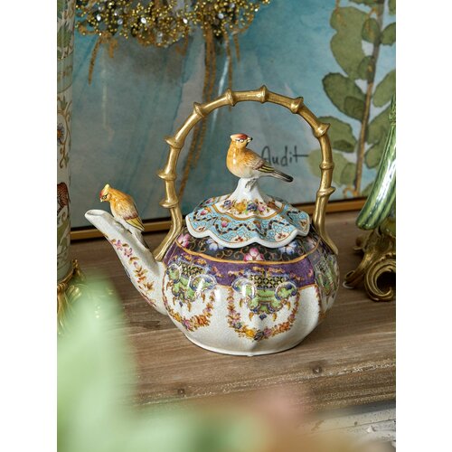 Декоративный чайник, выполненный из фарфора с бронзовыми элементами. Уникальное изделие ручной работы. При производстве этих художественных изделий из фарфора с бронзой используются вековые традиции китайских мастеров. Видимые трещинки (кракелюры) делаются по уникальной технологии, что придает более благородный вид старинного изделия. Вес изделия: 2,45кг. Размер: 22х15х22см. Материал: Фарфор, бронза. Производитель: Китай.