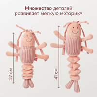 Подвесная игрушка вызовет у малыша настоящий восторг. Стоит схватить игрушку за нижние лапки, как она растянется и отпустив завибрирует. Малыш будет снова и снова тянуться к этому забавному персонажу, тренируя мышцы, память и логику. Лапки, тонкие усики с узелками приятно трогать, развивая мелкую моторику. Наблюдение за подвижными частями учит удерживать взгляд. • мягкая игрушка • множество деталей развивает мелкую моторику • способствует физическому развитию • развивает память и логику • удивляет и дарит хорошее настроение • благодаря завязкам можно подвесить в любое место дома, брать с собой на прогулки и в поездки