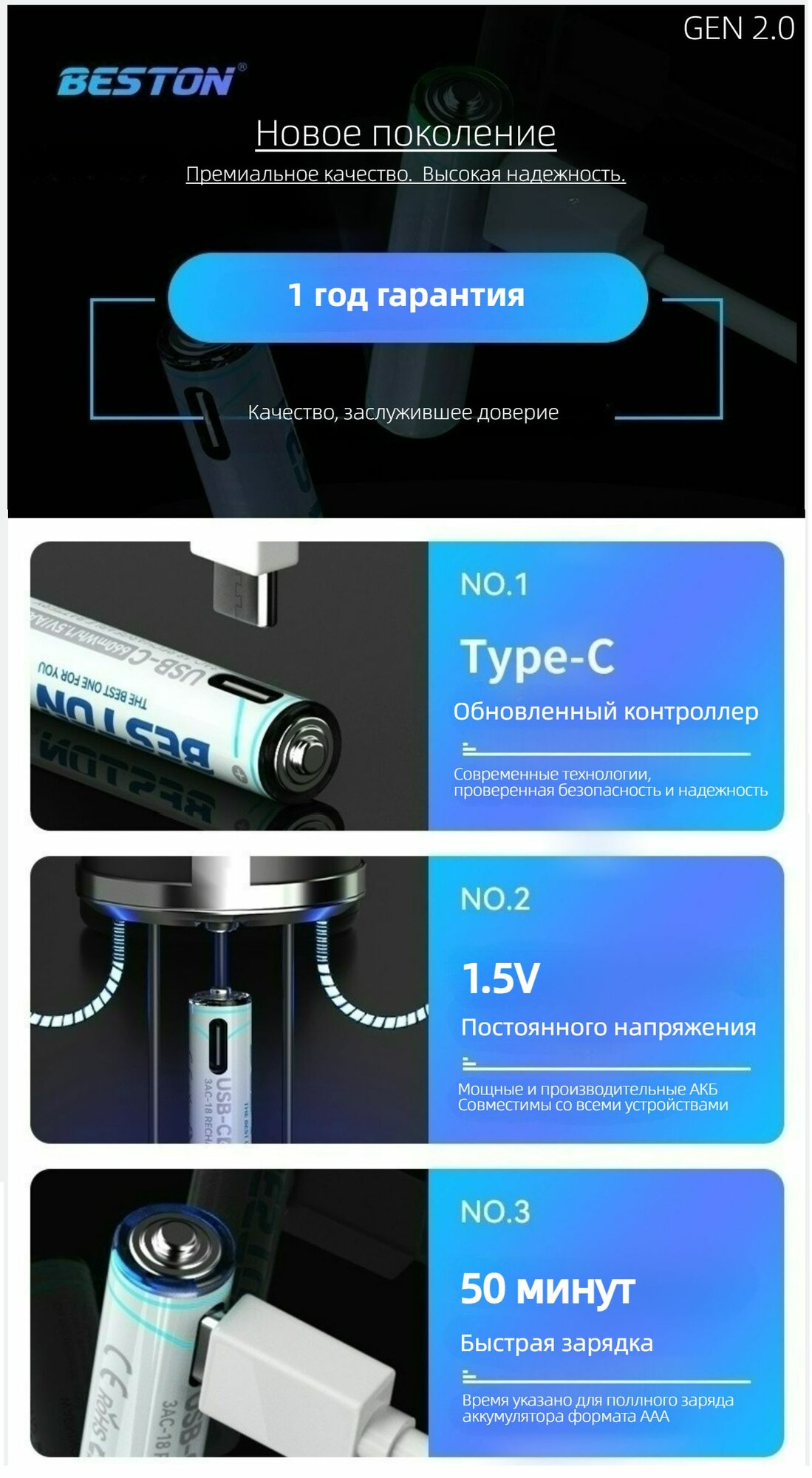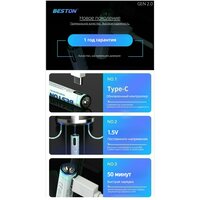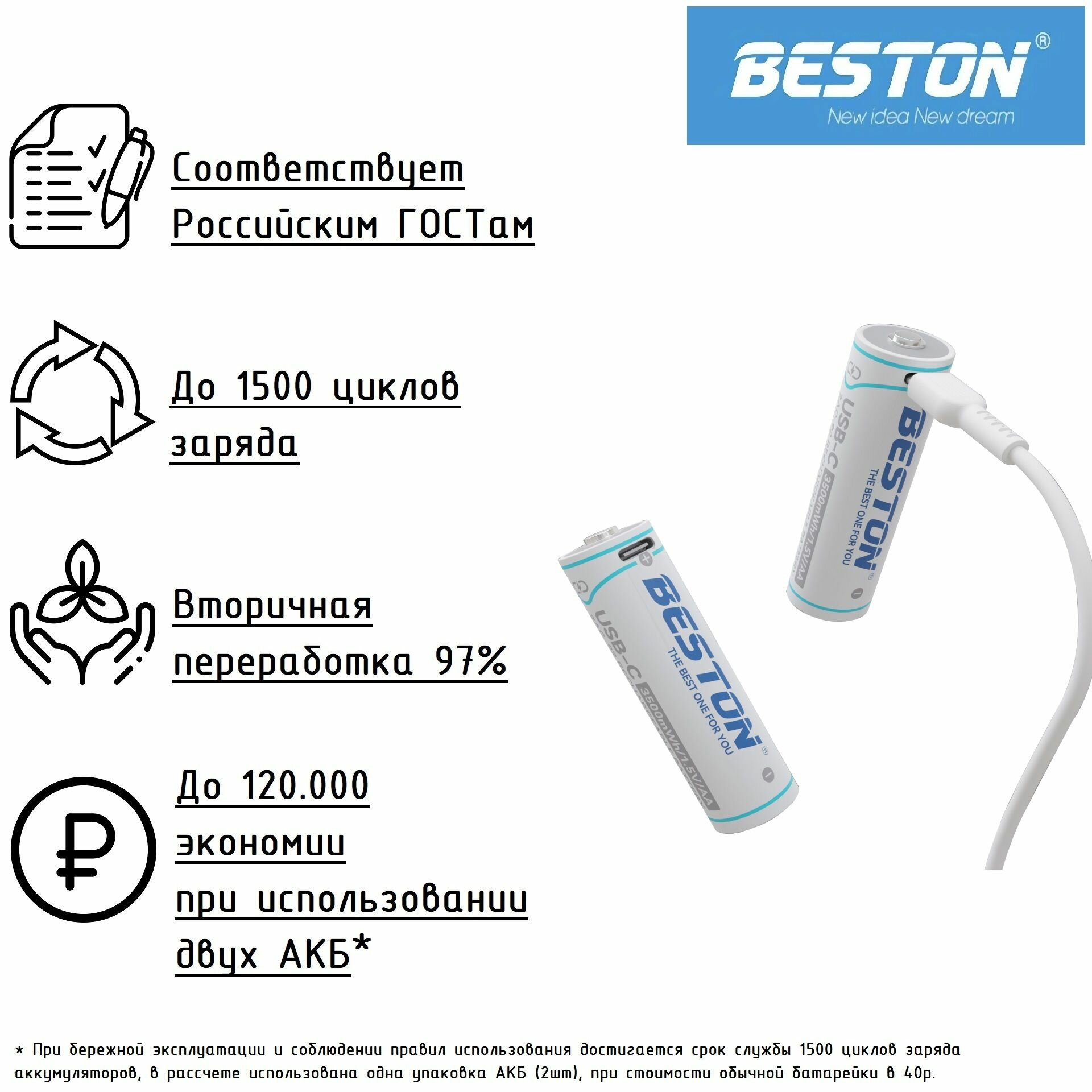 BESTON | Батарейка аккумулятор AA пальчиковая литий ионная USB заряд.