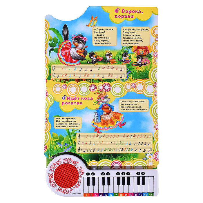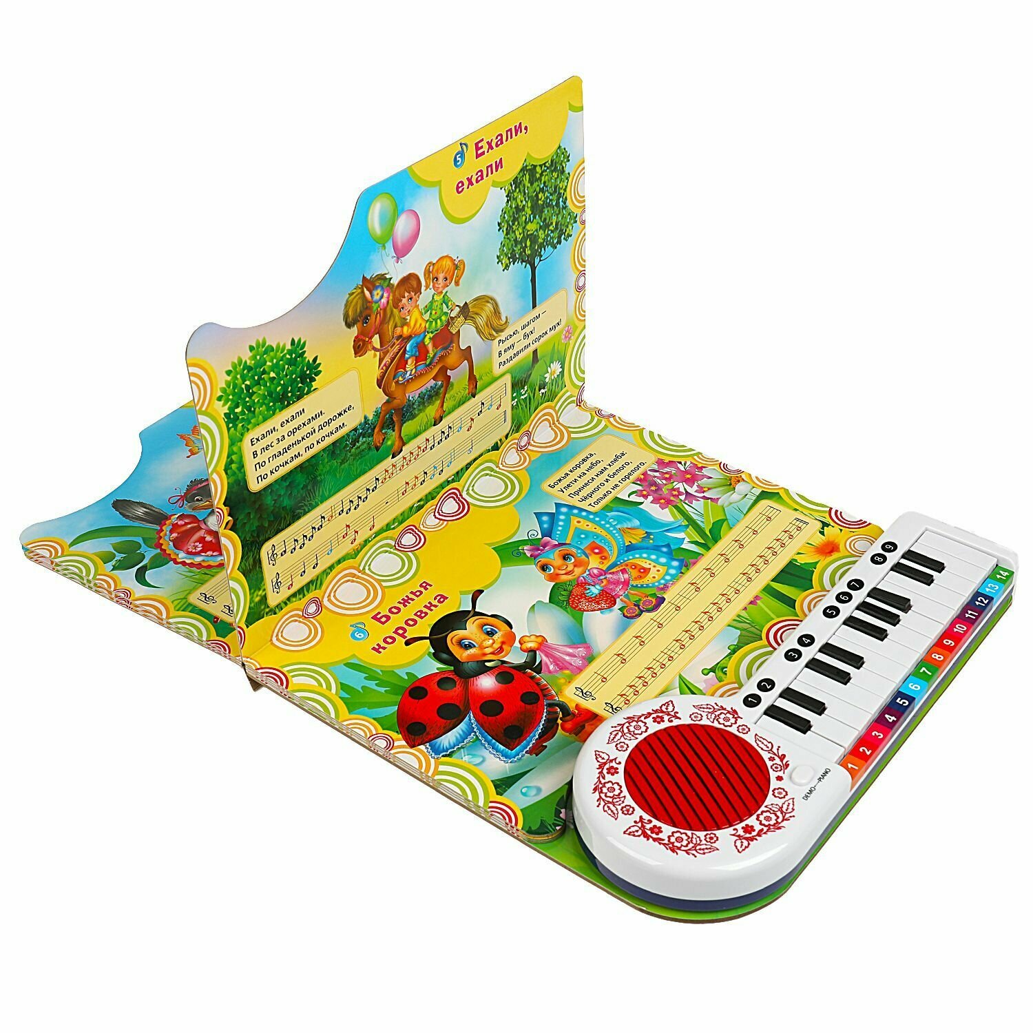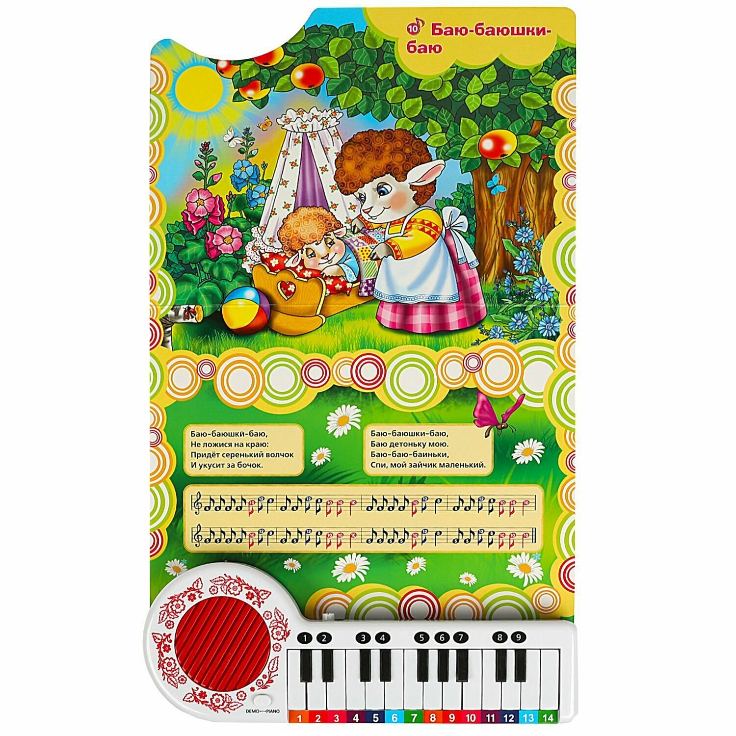 На каждой страничке это занимательной книги ребёнка ждут красивые иллюстрации, тексты потешек и ноты к песенкам. При нажатии на кнопку слева от клавиш происходит переключение на режим проигрывания песен, при втором нажатии - переключение на пианино. В режиме пианино маленький музыкант, нажимая на клавиши, сможет наиграть по нотам-подсказкам песенки из книги или придумать свои собственные мелодии. Книга сделана из плотного картона, поэтому мамы могут не опасаться, что ребёнок порвёт странички.