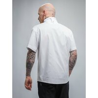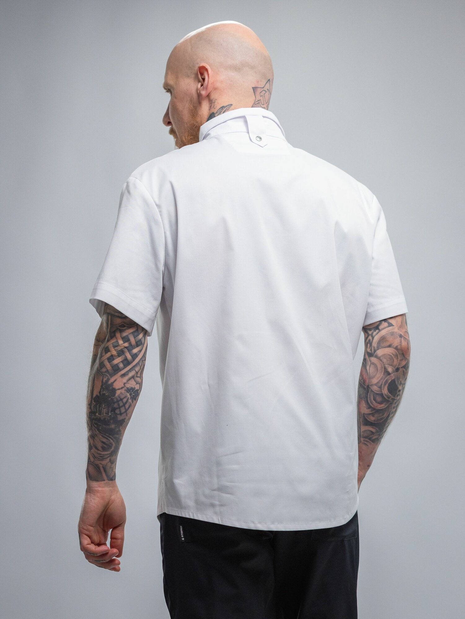 363WMC Профессиональный поварской китель-рубашка из лёгкой эластичной ткани. Модель прямого кроя, поэтому подойдёт для любой комплекции. Воротник рубашечного типа. Пата на воротнике сзади для фиксации фартука. Короткий рукав. Карман на рукаве для пинцета или ручки. Брендированные нержавеющие кнопки. Фирменный логотип в цвет кителя.