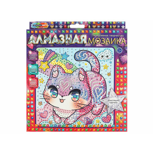 Набор для детского творчества алмазная мозаика Радужный котик из серии Сказочная мастерская ТМ Мульти Арт - отличный подарок для ребёнка, который будет способствовать развитию его творческих способностей. Особенности и комплектация:- картонная основа для мозаики- более 1000 деталей- комплект страз- ёмкость для страз- подставка- специальный инструмент- без клея и ножниц- инструкция на обороте упаковкиПри помощи этого набора маленький художник сможет создать красочную картинку-мозаику, декорированную разноцветными стразами. Яркую поделку можно подарить близким или использовать для украшения комнаты. Творческие занятия с алмазной мозаикой ТМ Мульти Арт обладают успокаивающим действием, а также развивают:- творческое мышление- цветовое восприятие- усидчивость- внимание- аккуратностьРазмер основы: 20 х 20 см. Материал: картон + пластмасса. Рекомендовано детям от 3-х лет.