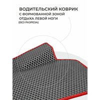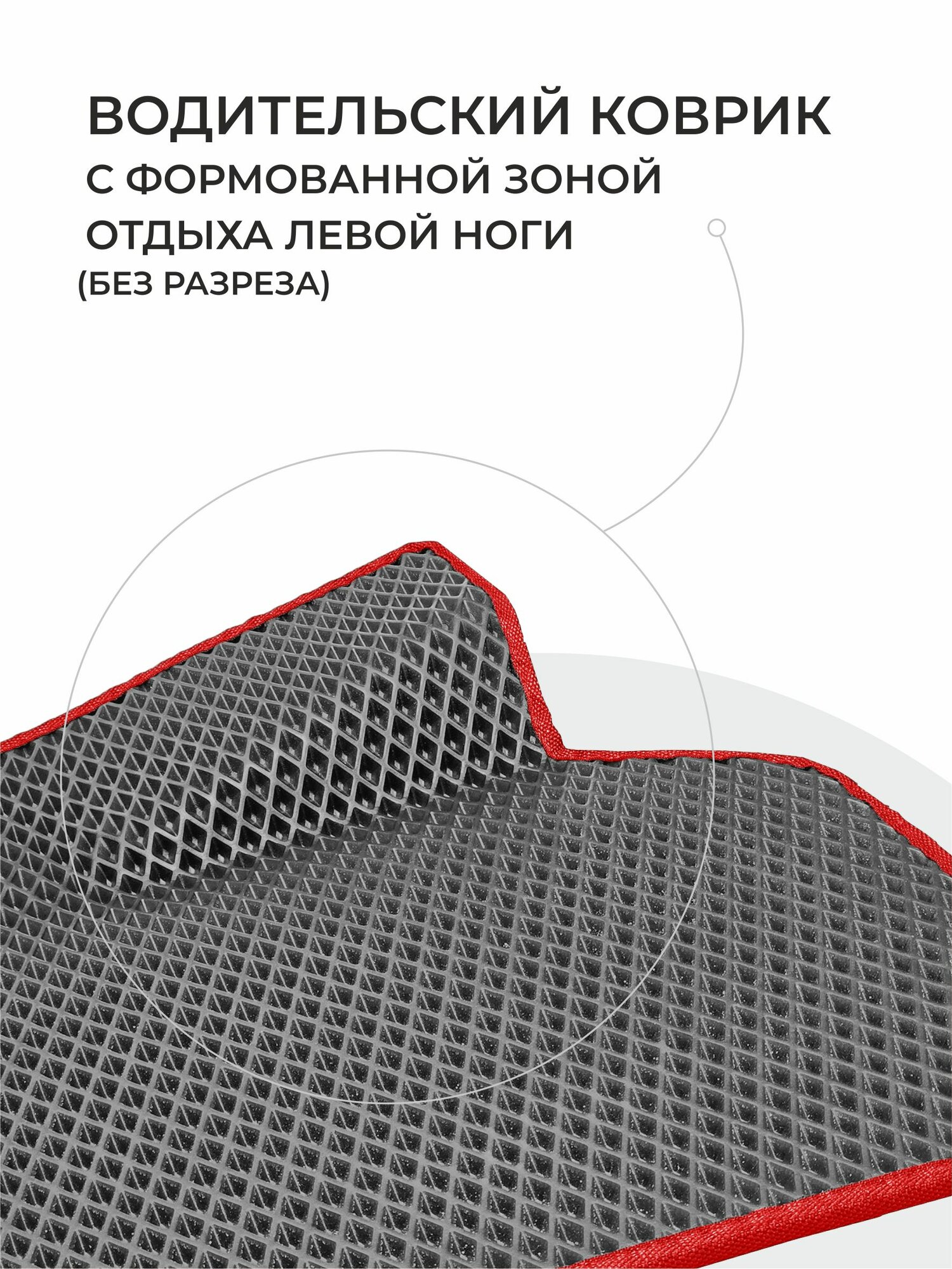 Водительский коврик цельный, без разреза, зона отдыха левой ноги полностью закрыта.