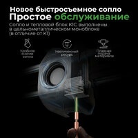 Сопло, состоящее из трех металлов, легко заменяется и плавно подает пластик.