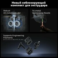 | Особенности | активное охлаждение, дисплей, подогреваемый стол, регулировка скорости, регулировка температуры, сканирование, смена сопла, цветная печать |