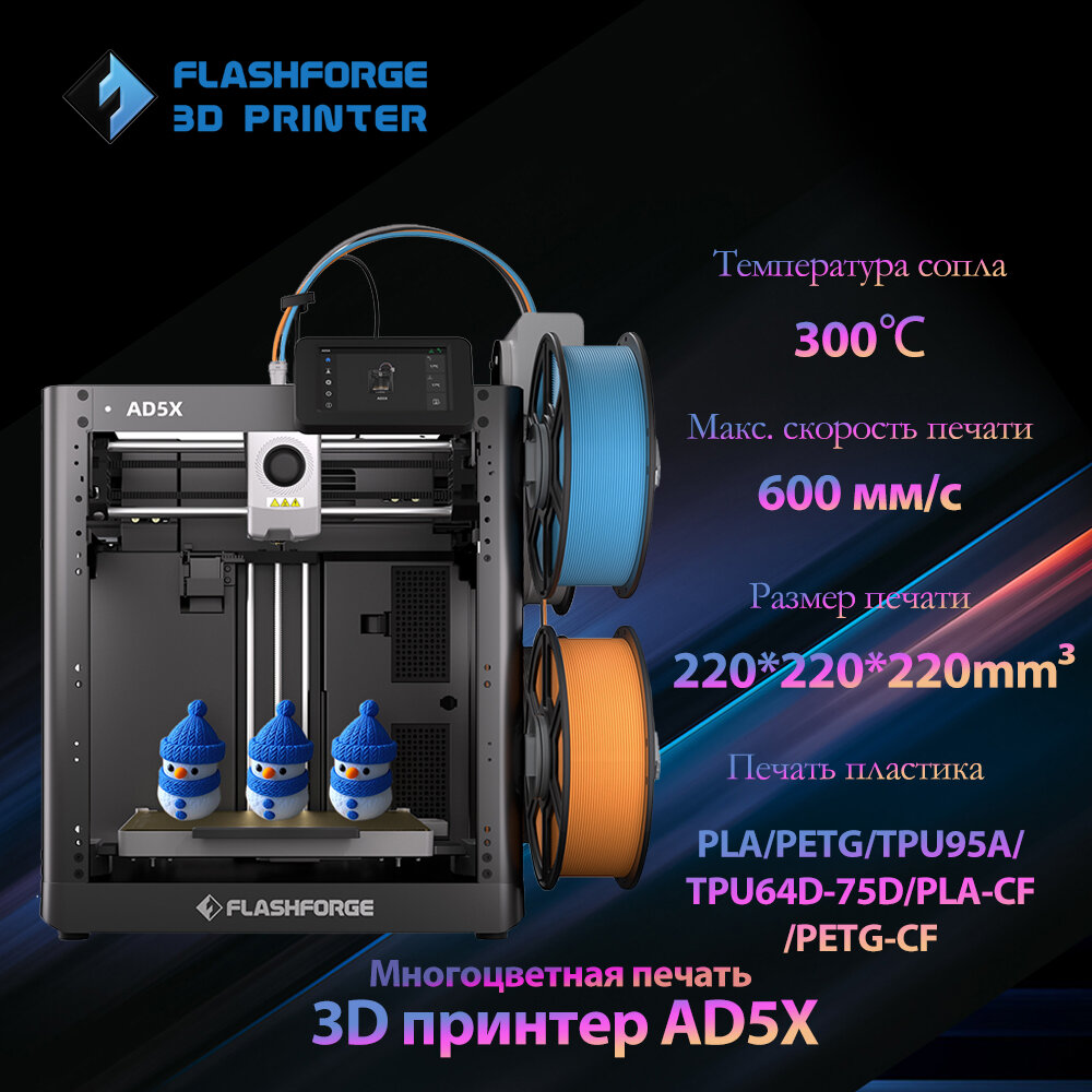 Купить 3D принтер FLASHFORGE AD5X: многоцветная печать, 300°C экструдер, Размер печати 220x220x220 мм, Макс. скорость 600 мм/с. с доставкой по всей России.