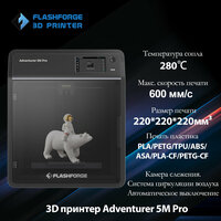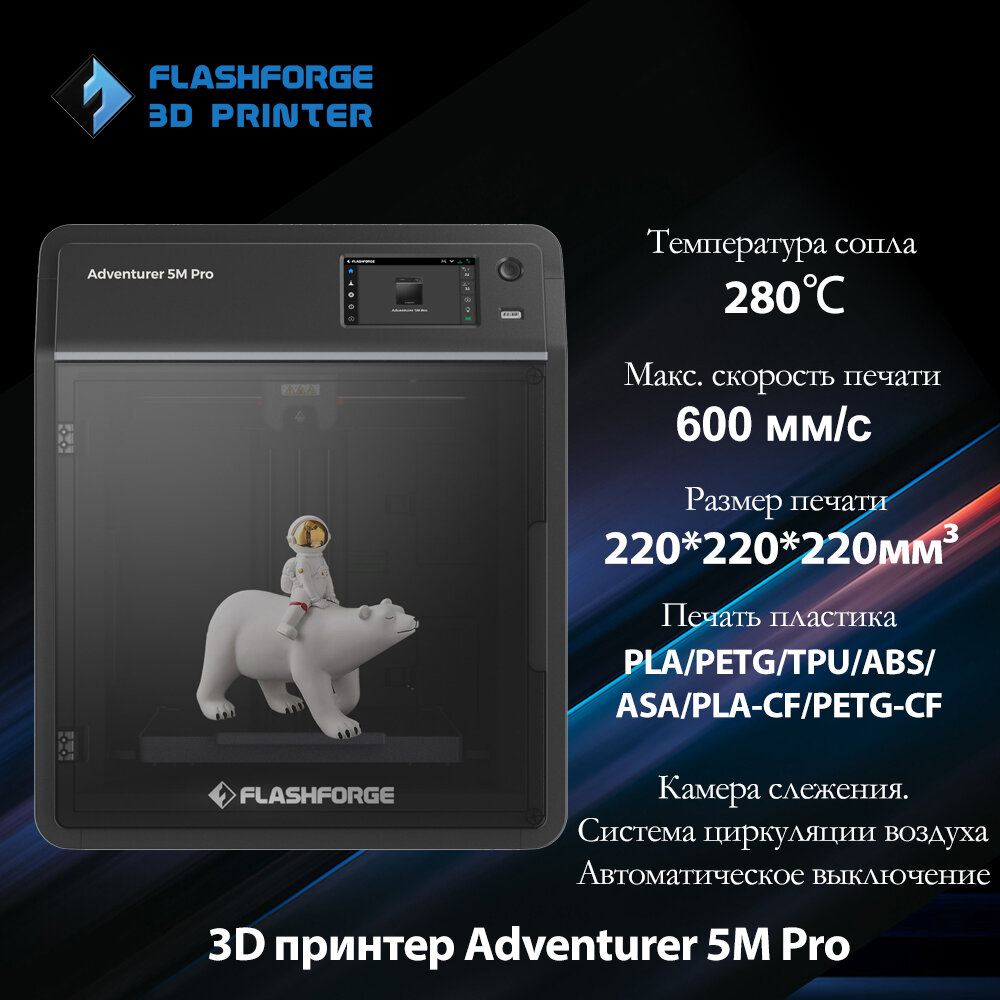 Купить 3D принтер FLASHFORGE Adventurer 5M Pro: 600 мм/с,220*220*220мм, закрытый, с фильтром и автовыключением с доставкой по всей России.