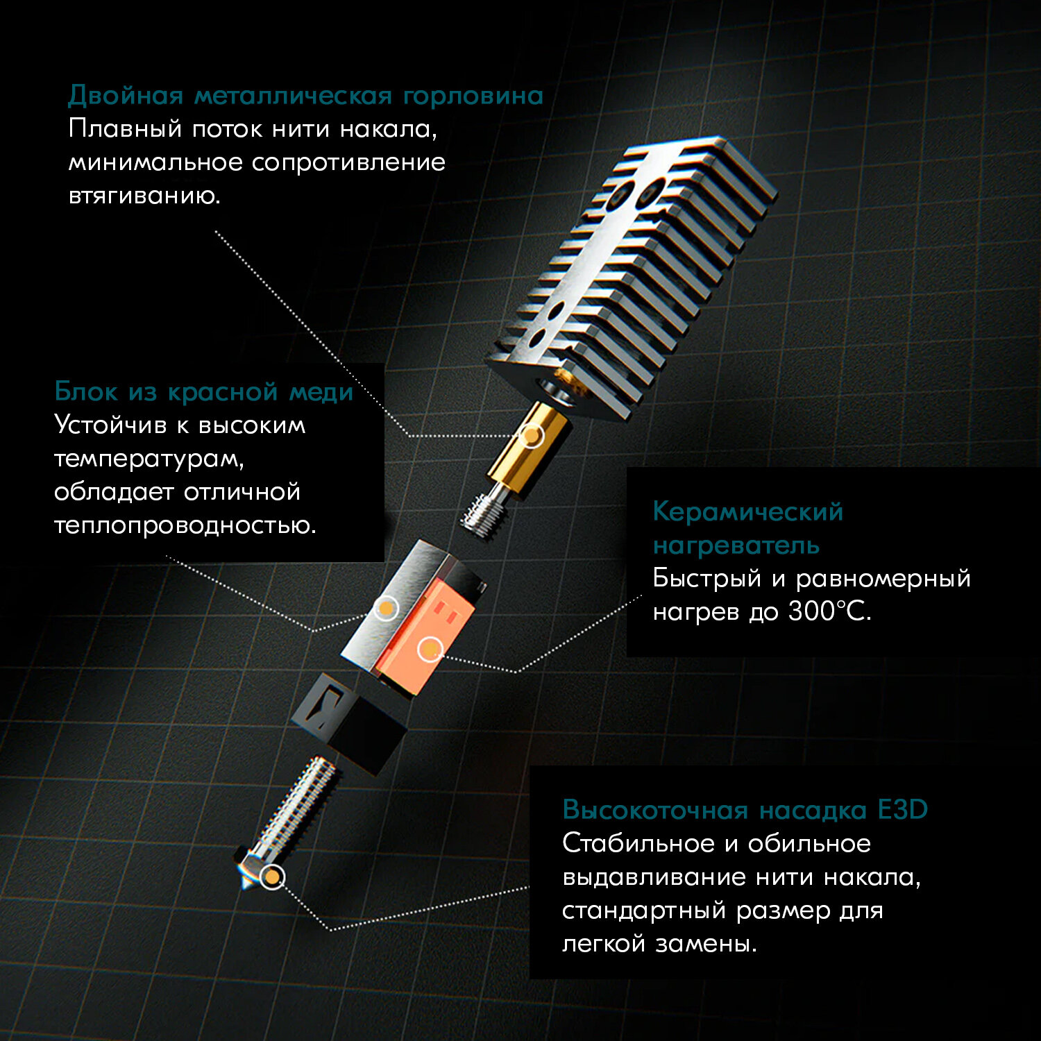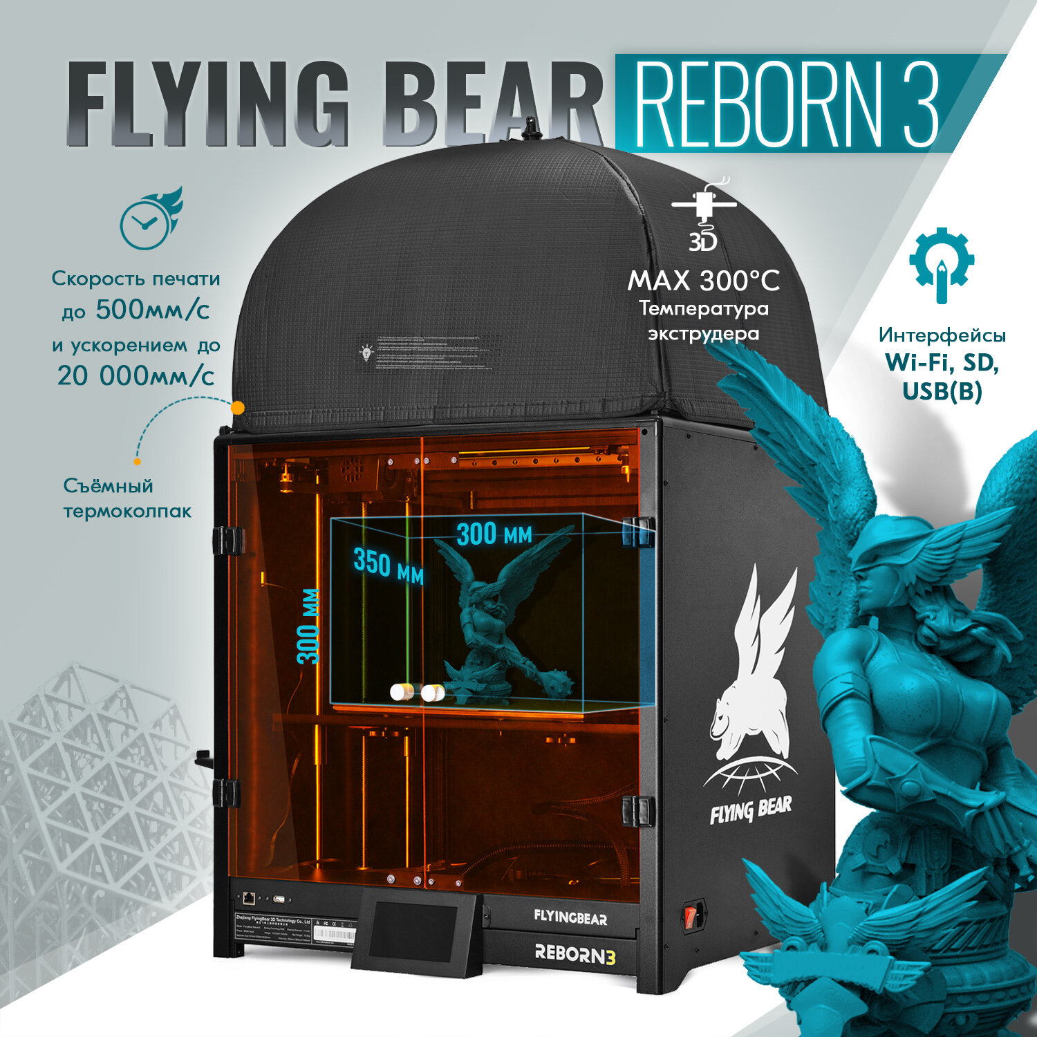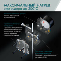 Reborn 3 - это современный 3D принтер, функциональный лёгкий в использовании, с большой областью печати 300*300*350мм. Алюминиевая рама-каркас с линейными направляющими и кинематикой core X-Y позволяют добиться отличного качества печати на очень высоких скоростях до 500мм/c и ускорением до 20 000мм/с2. Функция Pressure Advance за счёт расчёта компенсации потока значительно снижает наплывы на модели при смене направления движения экструдера. Автоуровень стола с картой высот по 120 точкам заметно улучшает печать первого слоя. Удобными будут подсветка зоны печати, съёмный магнитный стол и магнитное крепление кожуха хэдера (для быстрого доступа к соплу и экструдеру). Термоколпак, нагрев стола до 130°C и сопло Volcano E3D позволяют печатать даже самыми сложными пластиками Nylon и ABS. Биметаллическое горло препятствует перегреву тефлоновой трубки и образованию пробок. ARM64-bit Quad-Core с прошивкой Klipper оставляет большой простор для различных модификаций и тонкой настройки.
