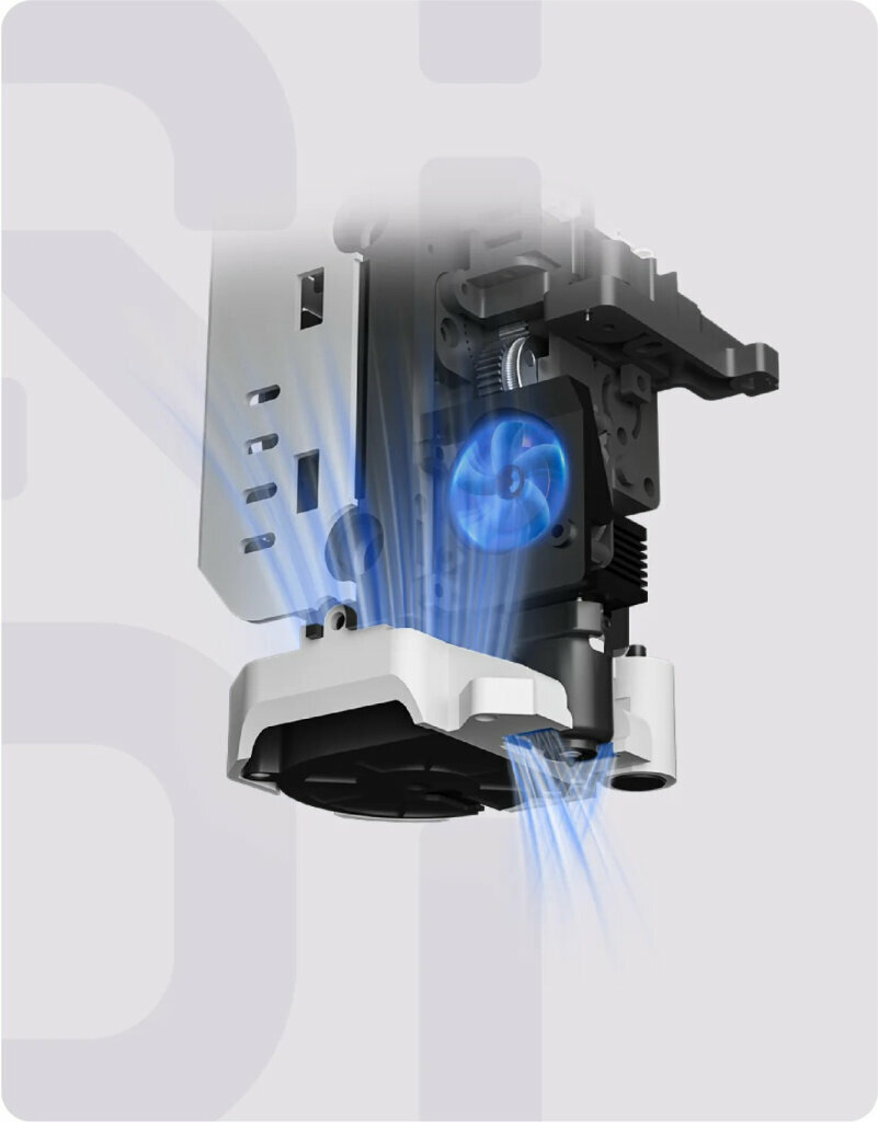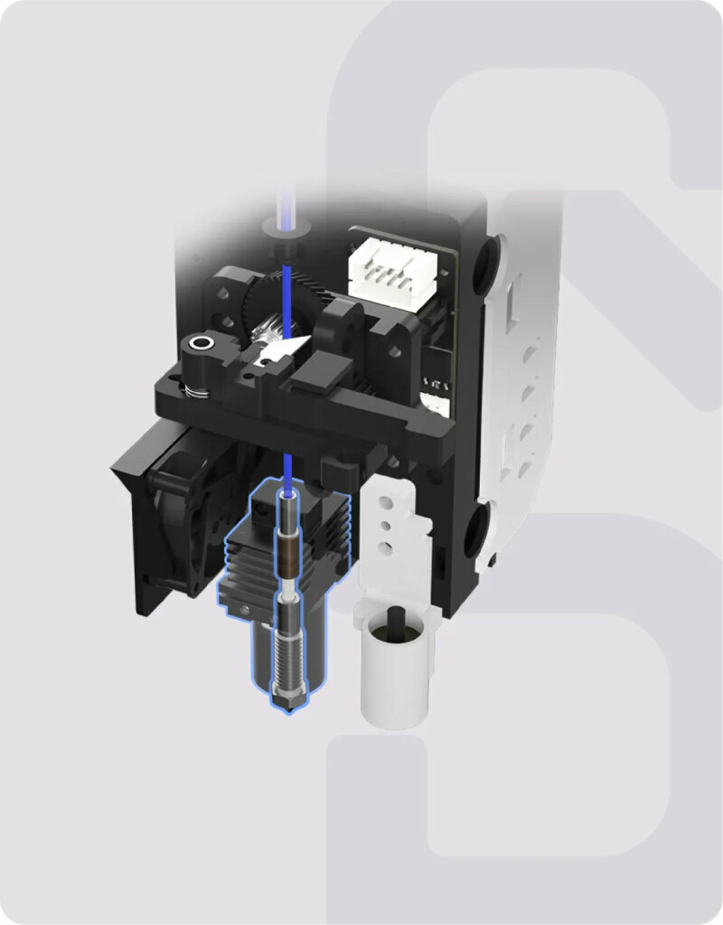 Благодаря обновленному хотэнду, возможна печать высокотемпературными материалами до 370°С. Мощность нагрева 80 Вт и мощный хотэнд позволяют легко печатать филаментами промышленного класса - PPS-CF. Кроме того, новое интегрированное биметаллическое сопло обеспечивает более высокую совместимость с филаментами, не требуя замены сопла при печати обычными филаментами, такими как ABS, PLA, или филаментами с добавлением волокон, такими как ABS-GF, PA-CF и PET-CF.