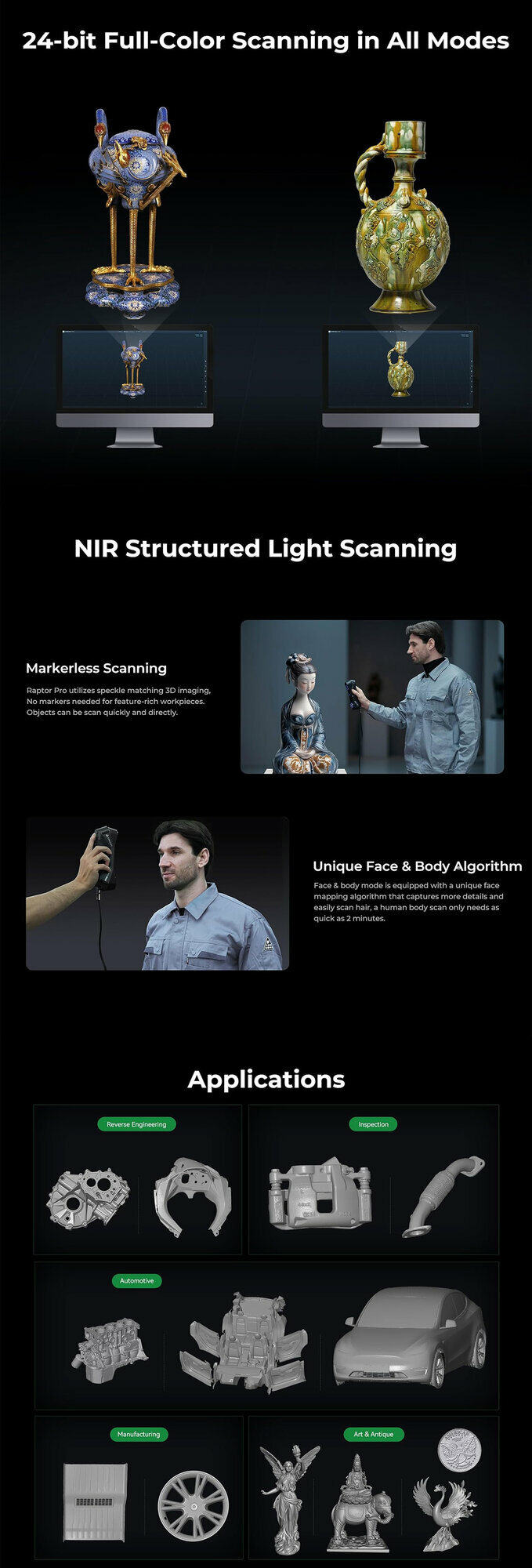 Ключевые преимущества: Высокоскоростное сканирование 22 перекрестных + 7 параллельных синих лазера (405 нм) Точность: до 0.02 мм (объемная: 0.02+0.08 мм/м) Скорость: 660 000 точек/сек (60 кадр/сек) Алгоритм температурной компенсации для стабильных результатов Без ограничений по поверхностям Работает без напыления даже с черными/металлическими объектами Диапазон размеров: от 5 мм до 4 метров Умное ПО CrealityScan Автообработка облака точек Экспорт в STL/OBJ/PLY Совместимость с ZBrush, SolidWorks Технические характеристики: Режим Синий лазер ИК-структурированный свет Точность 0.02 мм 0.075 мм Диапазон 270×170 мм 630×550 мм Расстояние 160-400 мм 170-1000 мм Освещение <50 000 люкс <30 000 люкс Системные требования: Windows 10/11 (i7-10gen+, NVIDIA 8GB+) macOS 11.7.7+ (M1/M2/M3, 16GB RAM) Вес: 405 г • Беспроводная работа Идеален для: Обратного инжиниринга Контроля качества Цифрового архивирования Для получения дополнительной информации посетите платформу Creality Wiki