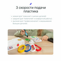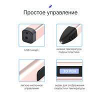 Комплектация: 3D ручка, удобный кейс для хранения, USB шнур, 10 цветов пластика, набор трафаретов.