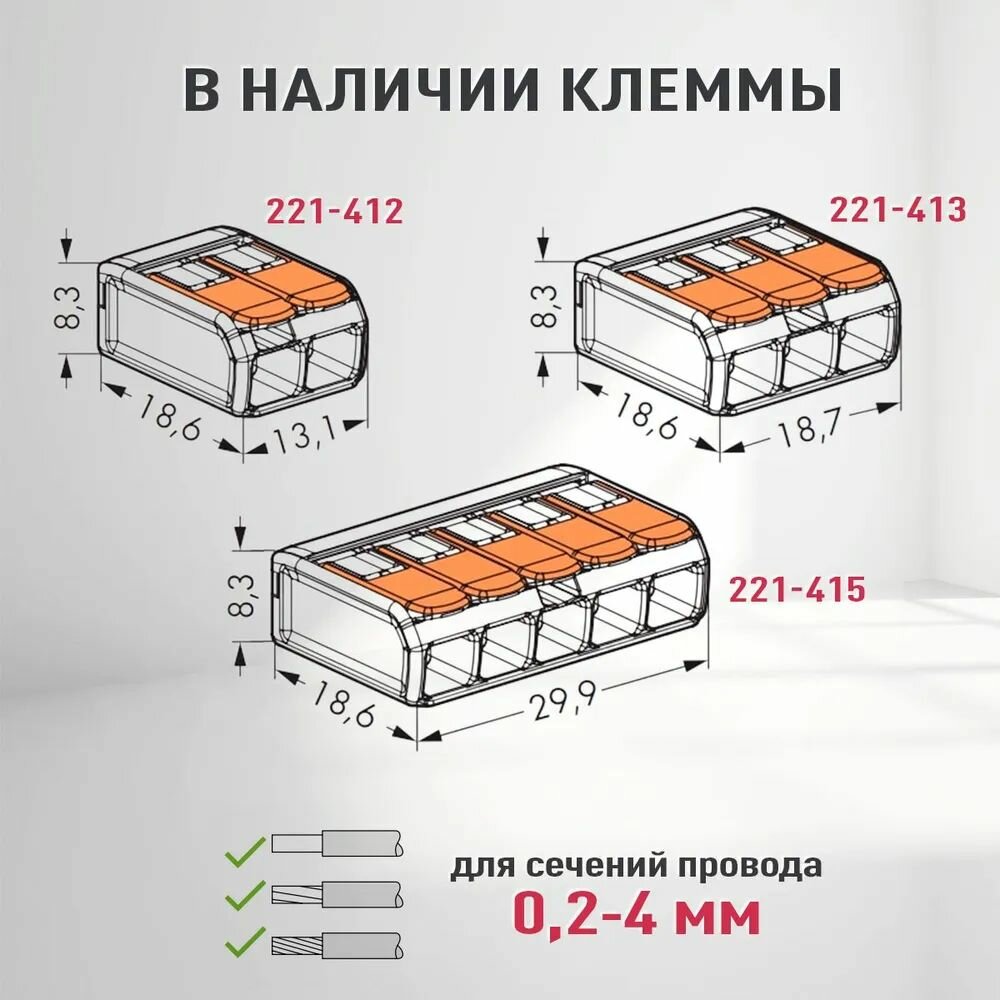 Универсальные компактные клеммы серии 221 значительно облегчают монтаж. Благодаря своим сверхкомпактным размерам клеммы WAGO серии 221 идеально подходят для применения в условиях ограниченного пространства. Монтаж значительно облегчается, также обеспечивается дополнительная свобода для будущих расширений. Прозрачный корпус — это еще одна особенность: теперь вы можете четко видеть, правильно ли подсоединены проводники и на правильную ли длину они зачищены. Кроме того, два легко доступных тестовых гнезда (одно в направлении входа проводника, одно в противоположном направлении) обеспечивают условия для простого тестирования даже после монтажа. Простота в обращении Рычаги серии 221 требуют приложения меньшего усилия для их открытия, что позволяет быстро и легко подключать проводники без использования инструментов! Захваты с углублениями по бокам корпуса клемм также предотвращают их выскальзывание и облегчают удерживание клемм при подключении проводника. Соединители для 2, 3 и 5 проводников используются для соединения проводников сечением от 0,14 до 4 mm, а также одножильных и тонкожильных проводников сечением от 0,2 до 4 mm (24–12 AWG). Поэтому они идеально подходят для соединения проводников различного сечения и типов друг с другом. Луженые токопроводящие стержни обеспечивают стабильное, газонепроницаемое и надежное соединение проводников. Клеммы серии 221 способны передавать ток до 32А/450В при максимальной продолжительной температуре 105°C, что делает их идеальным выбором для применений с малыми и большими нагрузками. Кроме того, одобрения ENEC и UL позволяют использовать их по всему миру.