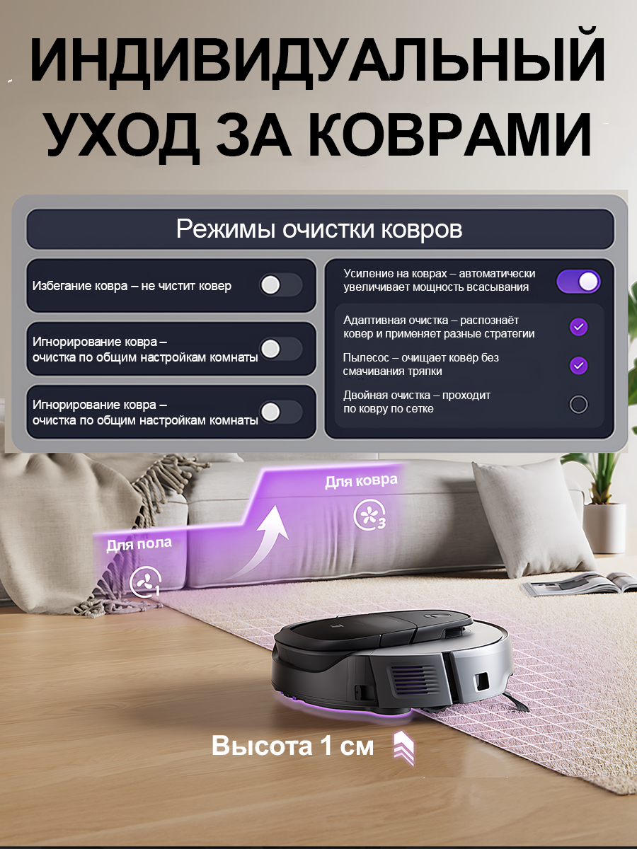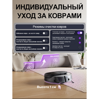 | Режимы | Y-образная траектория, быстрая уборка, движение вдоль стен, движение зигзагом, движение по спирали, местная уборка, турборежим, уборка по заданному маршруту |