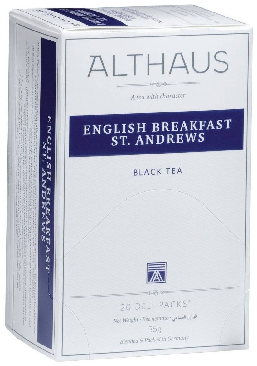 Чай Althaus Deli Packs English Breakfast черный байховый 20 пакетиков — это яркое воспроизведение оригинального купажа, созданного более 100 лет назад, который стал настоящей легендой и до сих пор является популярнейшим напитком среди ценителей чая. Для создания Althaus English Breakfast смешиваются лучшие сорта черного чая, обладающие смелым характером, насыщенным вкусом и достойной крепостью. Терпкий и сильный — он идеально сочетается с молоком, который органично смягчает его, даря бархатистую текстуру и приятный, сливочный вкус. Каждое утро с чашкой великолепного чая будет бодрым, энергичным и оптимистичным. Не менее удачным будет и обеденный перерыв с горячим, тонизирующим напитком, который станет настоящим помощником при высокой загрузке на работе, при принятии важных решений и проведении деловых переговоров. Он отлично освежает ум, повышает концентрацию внимания и восстанавливает растраченную энергию. Добавьте к нему кондитерские изделия или небольшие закуски, и это поможет прекрасно утолить голод и жажду. Классический вариант черного чая Althaus English Breakfast незаменим в домашней чайной коллекции, а также в офисе, ресторане, отеле и различных предприятиях. Для приготовления горячей чашки чая заварите чайный пакетик кипяченой водой и настаивайте 4-5 минут. В упаковке 20 пакетиков чая, каждый из которых надежно упакован в четырехслойный конверт, состоящий из белой бумаги с названием и фирменным логотипом, полиэтилена пониженной плотности, алюминиевой фольги и полипропилена, что исключает потерю первоначального вкуса и аромата чая в процессе транспортировки и хранения. Приятного чаепития! Состав: чай черный байховый высшего сорта. Способ приготовления: заварить чайный пакетик в чашке или заварочном чайнике кипяченой водой и настоять 4-5 минут. Вес: 35 г. Количество пакетиков в упаковке: 20 штук по 1,75 г. Тип упаковки: картонная коробка. Условия хранения: хранить в чистом, хорошо вентилируемом помещении без посторонних запахов с относительной влажностью воздуха не выше 70%. Страна производства: Германия.