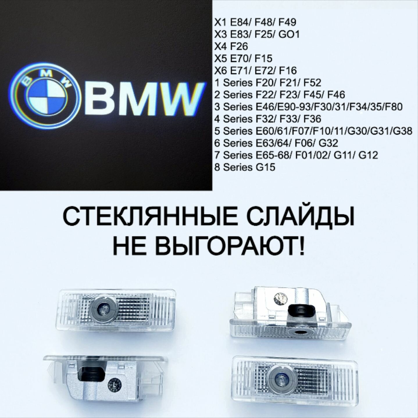 Купить 4 (четыре) плафона премиум в двери для автомобилей БМВ с лазерной проекцией логотипа. Стеклянные слайды. Логотип 1. с доставкой по всей России.