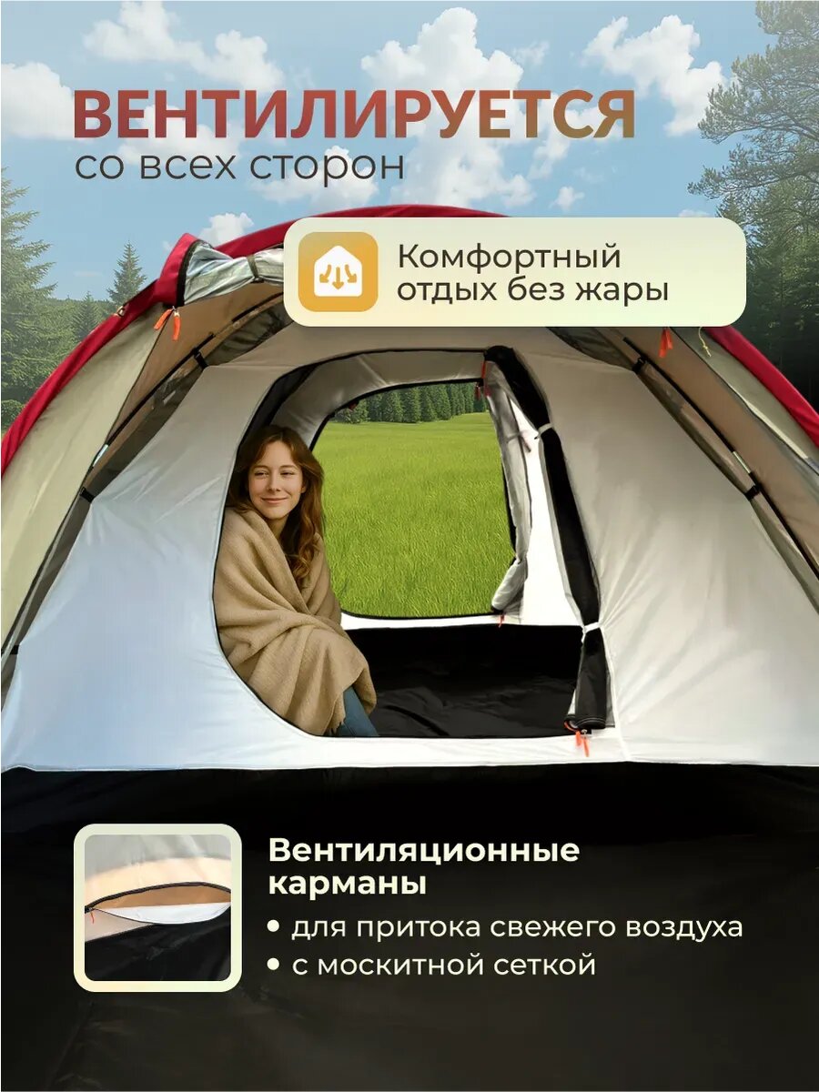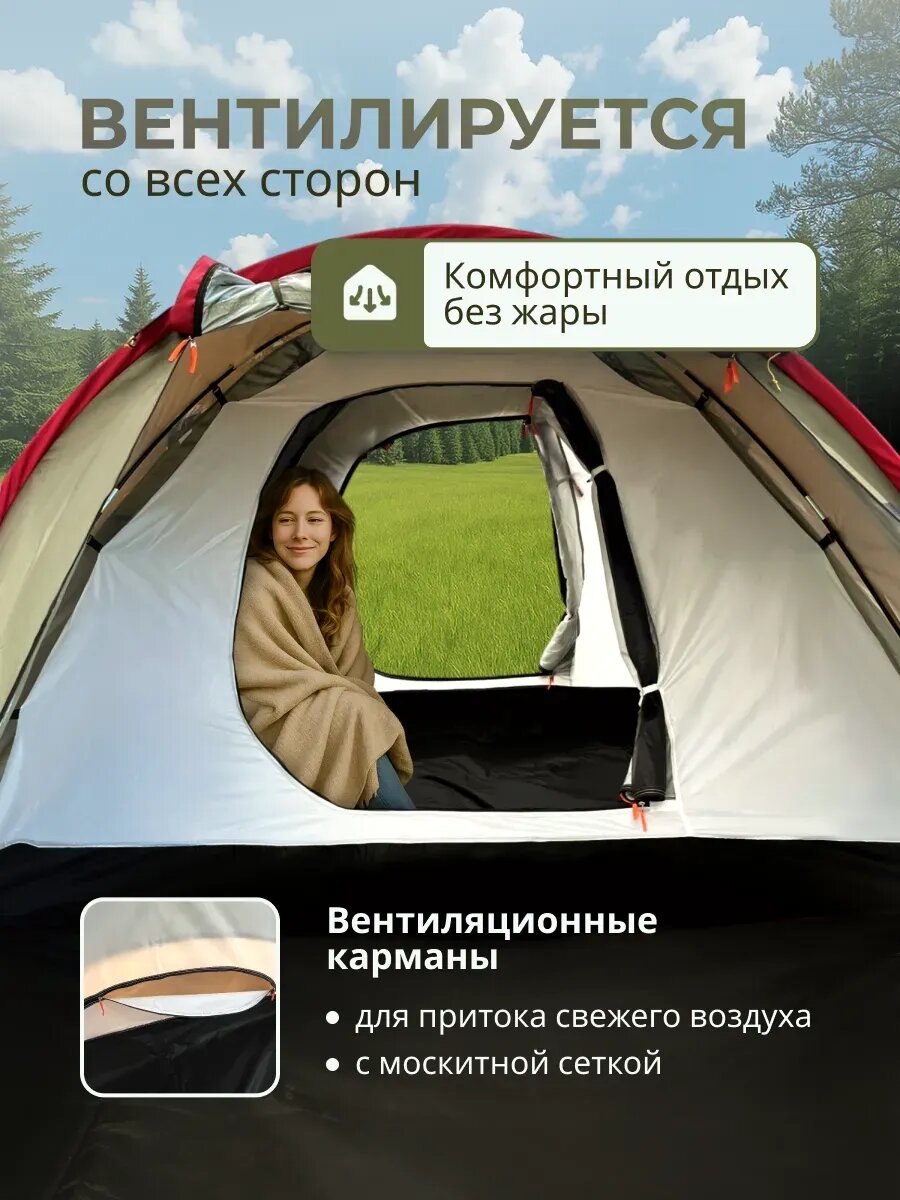 Отличный выбор для вас и вашей компании! Во время сна насекомые вас не потревожат, ведь вход в палатку и окно закрываются надежной антимоскитной сеткой.