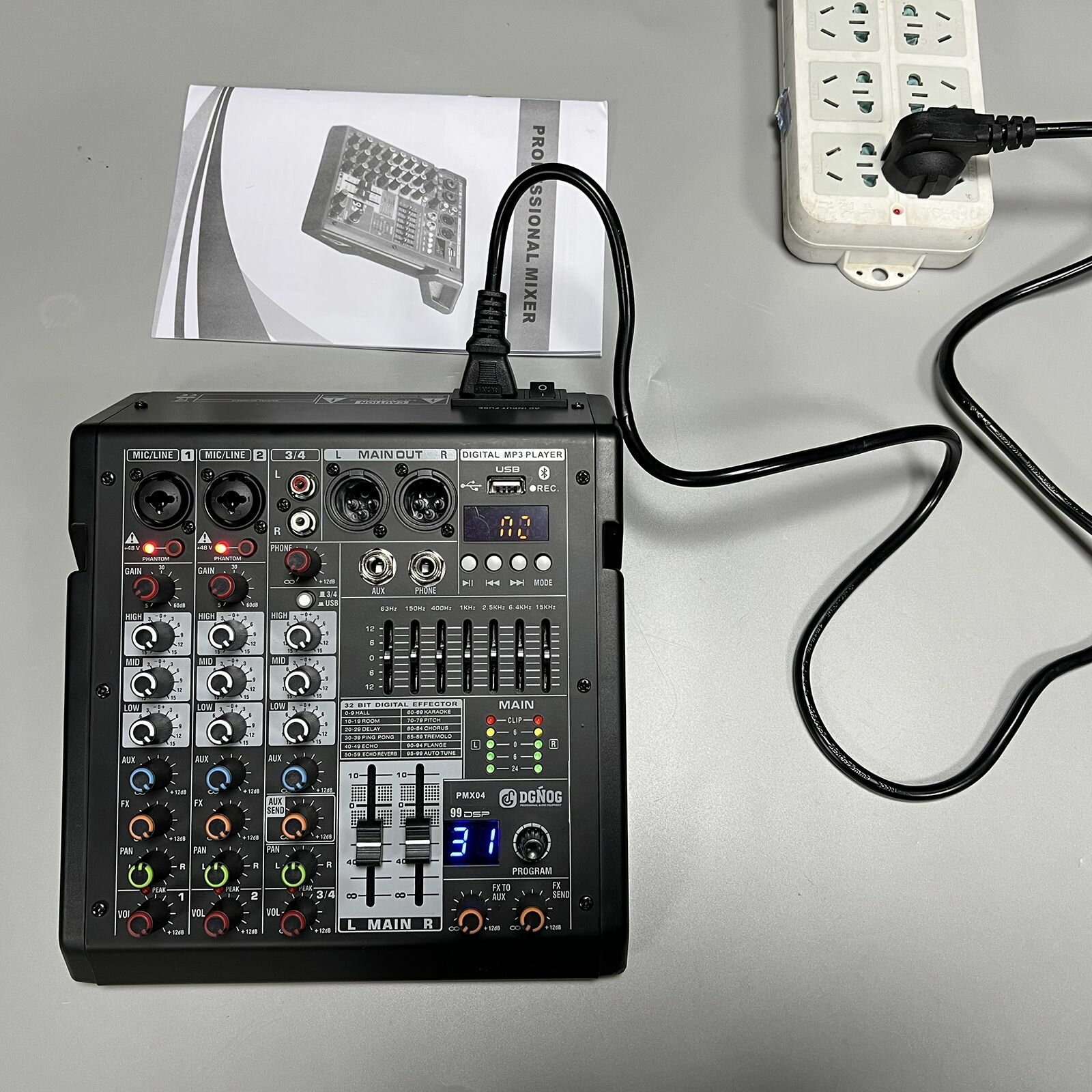 【DGNOG PMX04 Микшерный пульт】 - это очень удобный в использовании 4-канальный Микшерный пульт. PMX04 оснащен всеми необходимыми функциями Микшерный пульт. Встроенный звуковой процессор с эффектом 99DSP, встроенный MP3-плеер, поддержка различных музыкальных форматов, светодиодный индикатор состояния воспроизведения, 7-полосный ультрамузыкальный эквалайзер, линейный пиковый микрофонный вход для всех каналов, светодиодный индикатор, высокоточный индикатор уровня для всех каналов, герметичный переключатель фантомного питания (+48в) кнопочное управление.