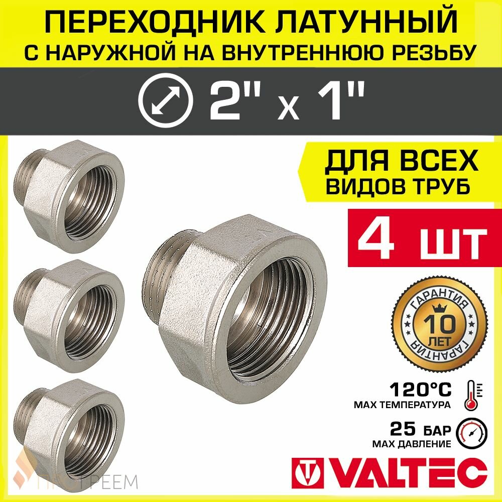 4 шт — Переходник 2″ ВР х 1″ НР VALTEC латунный сантехнический / Фитинг резьбовой — переход с наружной на внутреннюю резьбу для соединения труб диаметром ДУ50 и ДУ25, арт. VTr.592. N.0906: сравнение цен, характеристики, фото, актуальное наличие и цены.