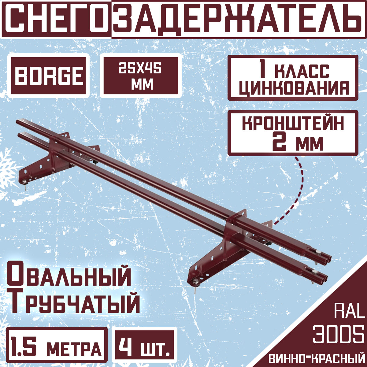 4 штуки по 1,5 м снегозадержателей трубчатых овальных 25х45 Borge (6 метров / 8 кронштейнов) винно-красный для кровли из металлочерепицы, профнастила и гибкой черепицы (RAL 3005): сравнение цен, характеристики, фото, актуальное наличие и цены.