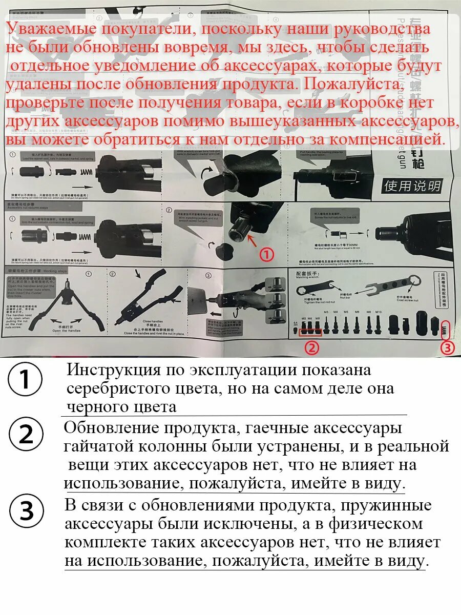 Некоторые покупатели сообщили, что в фурнитуре полученных ими изделий отсутствовали пружины, поэтому поясним их здесь. Корпус нашего изделия был модернизирован, и нет необходимости устанавливать пружины, но инструкция по эксплуатации не обновлялась, поэтому если вы получите изделие без пружинного аксессуара, не переживайте, это никак не повлияет на ваше использование. Пожалуйста, свяжитесь с нами, отправив номер заказа после заказа, чтобы подтвердить содержание заказа, и мы можем связаться с вами напрямую, если возникнут проблемы с последующим заказом. Этот продукт - многофункциональный инструмент “три в одном”, включающий риветовочный пистолет, гаечный ключ и развертку. , совместимые размеры насадок: M3/M4/M5/M6/M8/M10. Размеры насадок для риветов: 2.4/3.2/4/4.8/6.4 мм. Разверточные ножи могут быть квадратной или дуговой формы. Комплектация также включает в себя отвертку для демонтажа.