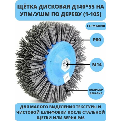 Щетка дисковая с нейлон абразивным ворсом зернистостью P80 применяется для обработки дерева, разных деревянных изделий с помощью ручного электроинструмента угловой полировальной машины (УПМ), угловой шлифмашины (УШМ, болгарка) с регулятором оборотов на 1-2 скорости. Используется Нейлоновая дисковая щетка 140 Р80 (код 1-105) для чистовых операций шлифовки древесины; малой (менее 0,5 мм) глубины браширования мягких пород дерева. Иными словами, для подчеркивания красивой текстуры дерева с одновременно чистовой шлифовкой любых деревянных горизонтальных плоских поверхностей перед операцией полировки и окраски.