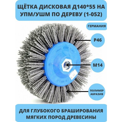 Щетка дисковая с нейлон абразивным ворсом зернистостью P46 применяется для обработки дерева, разных деревянных изделий с помощью ручного электроинструмента угловой полировальной машины (УПМ), угловой шлифмашины (УШМ, болгарка) с регулятором оборотов на 1-2 скорости. Используется Нейлоновая дисковая щетка 140 Р46 (код 1-052) для предварительных операций зачистки и шлифовки древесины от потемнений, старой шелушащейся краски, грязи, сглаживания следов от рубанка, топора и других подобных изъянов; глубокого (более 2,0 мм) браширования мягких пород дерева и подчеркивания текстуры на твердых породах. Иными словами, для выделения красивой текстуры дерева с одновременно предварительной шлифовкой любых деревянных горизонтальных плоских поверхностей перед операцией промежуточной или чистовой шлифовки.