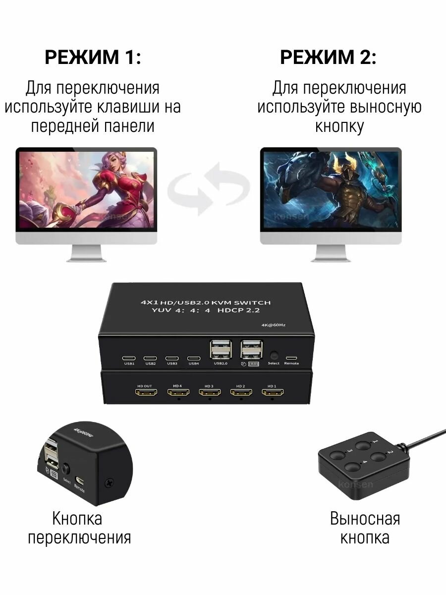 Купить 4K USB HDMI KVM Switch свитч, переключатель квм 4-1 свитчер модель 2023 года с выносной кнопкой с доставкой по всей России.