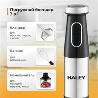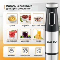 Мощный погружной блендер - Погружной блендер HALEY с мощностью 1600 Вт и 4 острыми лезвиями способен легко смешивать, измельчать комки, упорные lumps, мясо и твердые фрукты для приготовления смузи, супов, молочных коктейлей и теста. Скажите «прощай» комковатым соусам и тестам и наслаждайтесь здоровыми и вкусными блюдами каждый день.