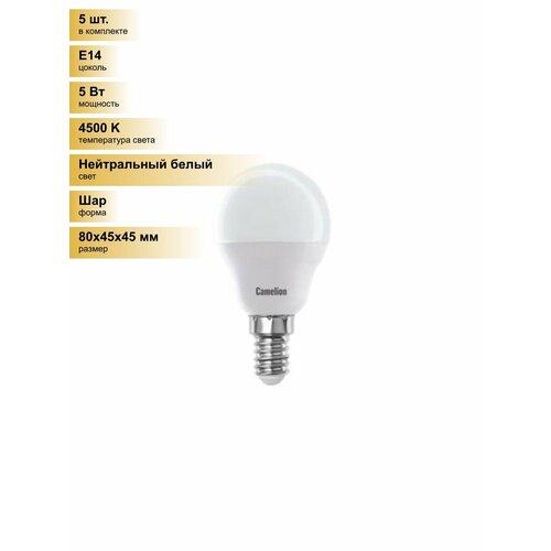 (5 шт.) Светодиодная лампочка Camelion Шар G45 E14 5W(405lm 220°) 4500K 4K матов. 80×45 пластик LED5-G45/845/E14 Нейтральный белый. Цоколь E14: сравнение цен, характеристики, фото, актуальное наличие и цены.