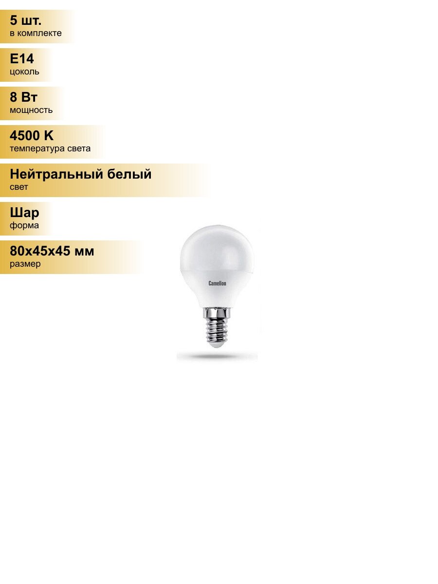 (5 шт.) Светодиодная лампочка Camelion Шар G45 E14 8W(750 220°) 4500K 4K матов. 80×45 пластик LED8-G45/845/E14 Нейтральный белый. Цоколь E14: сравнение цен, характеристики, фото, актуальное наличие и цены.