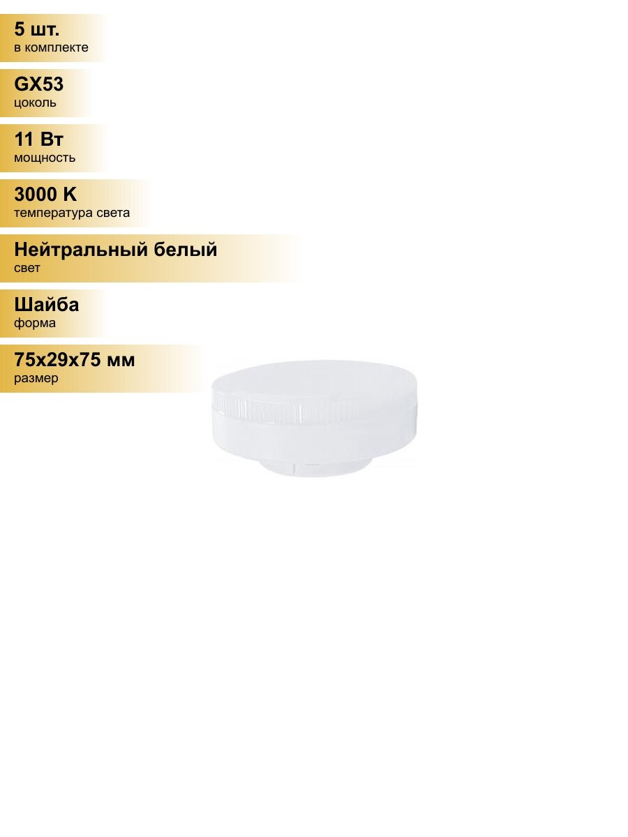 (5 шт.) Светодиодная лампочка Gauss GX53 11W(1050lm) 3000K 2K 29×75 матов, пластик 108008111 Нейтральный белый. Цоколь GX53: сравнение цен, характеристики, фото, актуальное наличие и цены.
