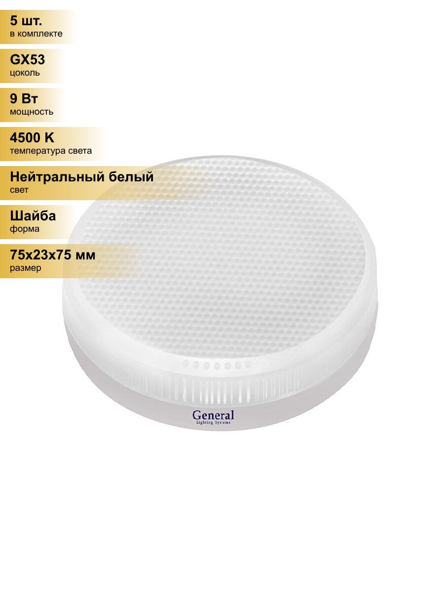 (5 шт.) Светодиодная лампочка General GX53 9W 4500K 4K 75×23 призма пластик GLDEN-GX53-9-230-GX53-4500 660363 Нейтральный белый. Цоколь GX53: сравнение цен, характеристики, фото, актуальное наличие и цены.