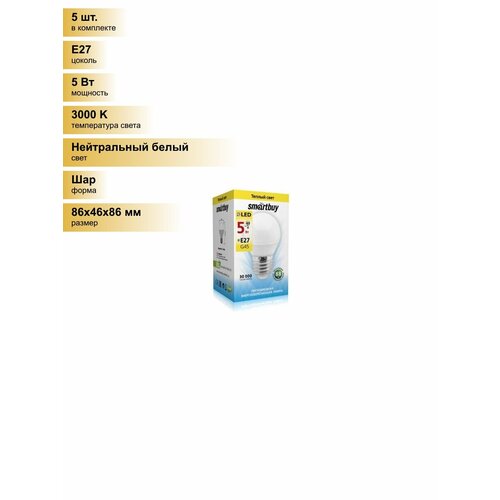 (5 шт.) Светодиодная лампочка Smartbuy шар G45 E27 5W(350lm) 3000K 2K матовая пластик SBL-G45-05-30K-E27 Нейтральный белый. Цоколь E27: сравнение цен, характеристики, фото, актуальное наличие и цены.