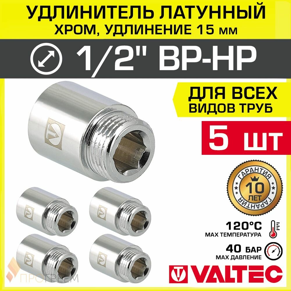 5 шт — Удлинитель 1/2″ НР-ВР х 15 мм VALTEC хромированный сантехнический / Латунный резьбовой фитинг для удлинения соединений труб ДУ15 в системе отопления и водоснабжения, VTr.198. C.0415: сравнение цен, характеристики, фото, актуальное наличие и цены.