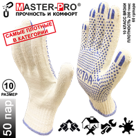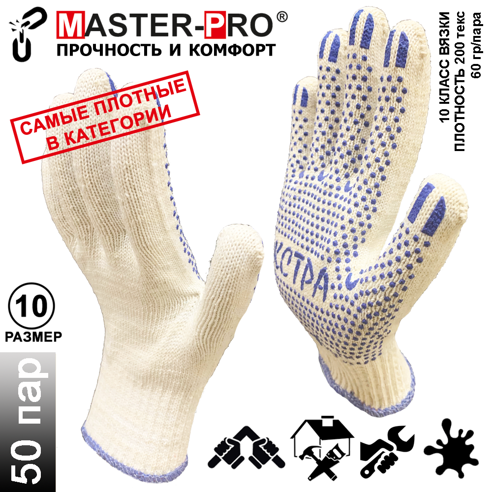 50 пар. Категория А+. Плотные рабочие х/б перчатки Master-Pro экстра, 10 класс вязки, плотность 9/10, размер 10 (XL): сравнение цен, характеристики, фото, актуальное наличие и цены.