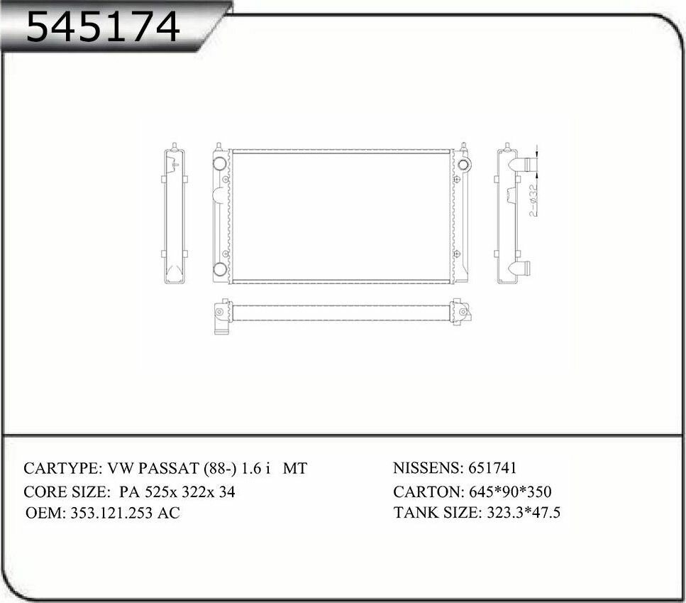 545174 Радиатор охлаждения для VW Passat B3 1.6-1.8 (88-93), Passat B4 1.8 (93-96) без A/C: сравнение цен, характеристики, фото, актуальное наличие и цены.