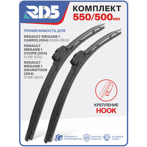 550 500 мм. Крепление Hook. Комплект бескаркасных щеток стеклоочистителя RD5 дворники на Renault Megane I Cabrio ; Рено Меган 1 Кабриолет; Renault Megane I Coupe; Рено Меган и Купе; Renault Megane I Grandtour; Рено Меган I Грандтур