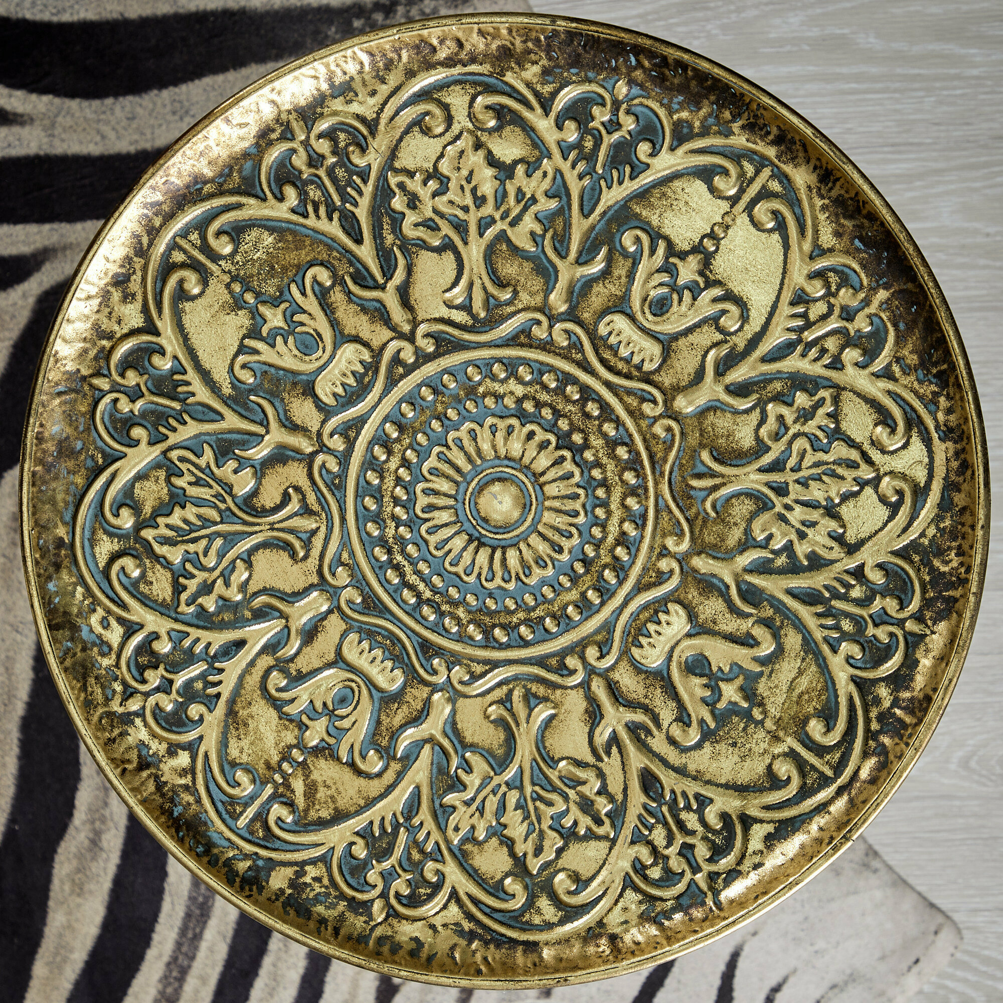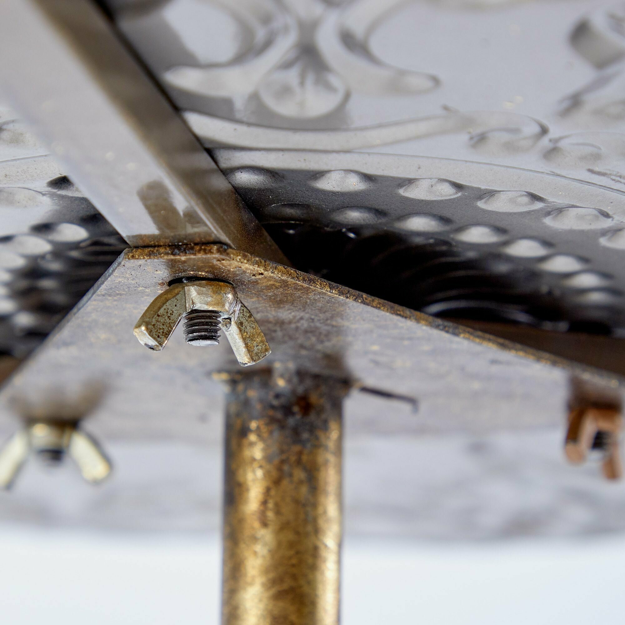 Столешница столика выполнена из железа и имеет круглую форму, что придает ему неповторимый и оригинальный вид. На столешнице присутствует орнаментная фактура и признаки искусственного состаривания, что делает его еще более привлекательным.