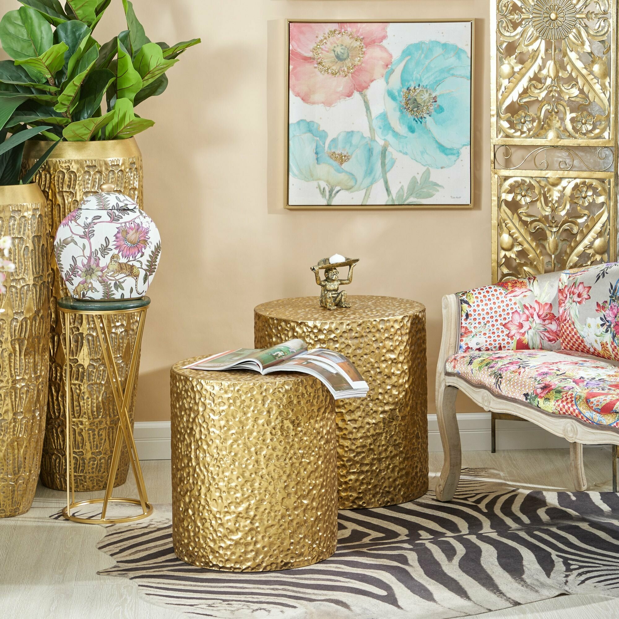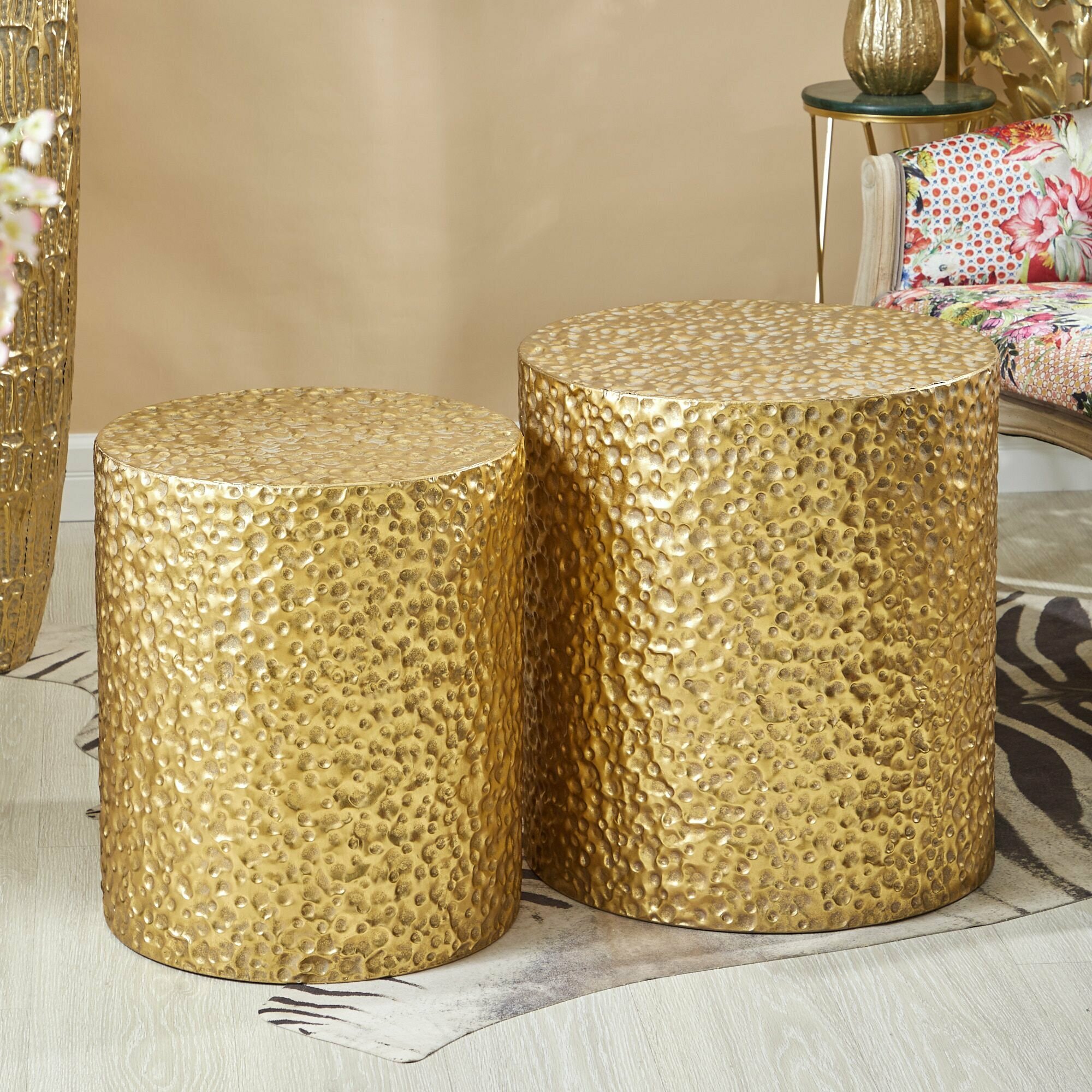 Набор из двух столиков Калахари, выполненных из металла в африканском стиле, с напылением золотистого цвета и украшенных фактурной отделкой на корпусе. Оригинальная форма столика подчеркнет ваш изысканный интерьер своей неповторимостью. Эксклюзивные формы и фактуры навеяло богатство культуры Африки, множество художественных традиций и таинственная атмосфера, окутывающая неподражаемостью. Вес изделия: 6,51кг. Размер: 52х52х56; 44х44х51см. Материал: Железо. Производитель: Китай.