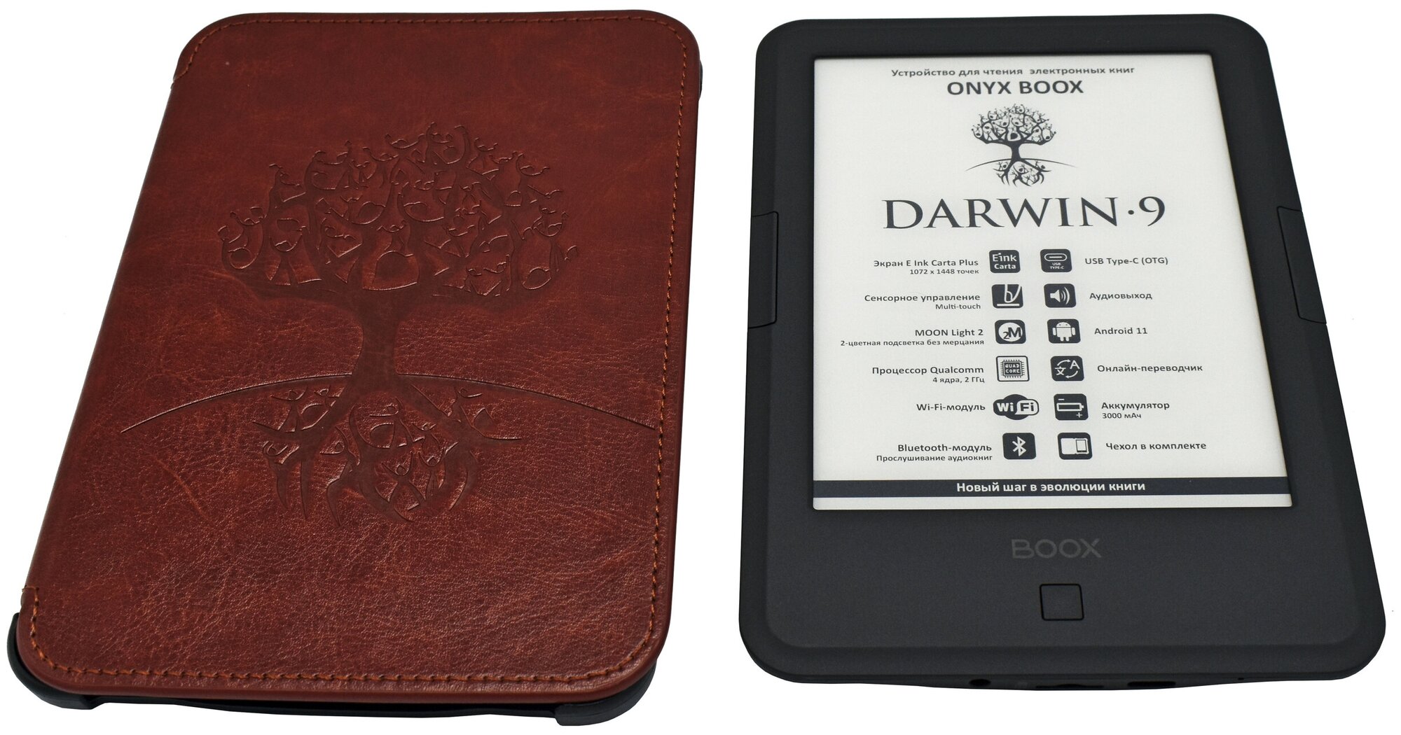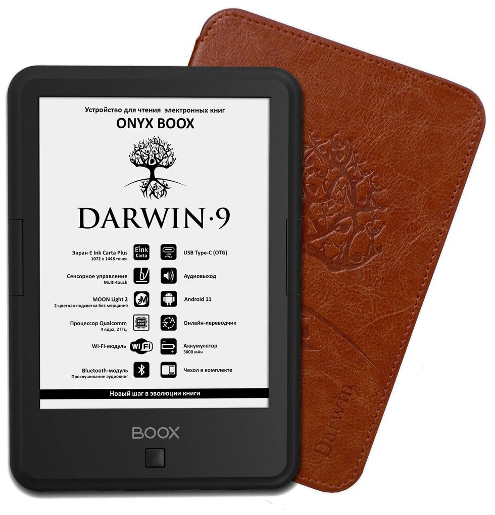 В числе предустановленных программ имеются очень функциональные читалки документов, книг и комиксов, браузер, плеер, клиенты электронной почты и фирменного облачного сервиса ONYX BOOX, а также приложение «Словарь», доступное в том числе при чтении книг и совместимое со словарными базами StarDict. Кроме того, стоит сказать, что на борту Darwin 9 имеются современные модули Bluetooth (5.0) и Wi-Fi (802.11ac), аудиоразъём 3,5 мм, слот для карточек памяти microSD и порт USB Type-C с поддержкой OTG. Как и предыдущие представители серии Darwin, новинка оснащается аккумулятором ёмкостью 3000 мАч и комплектуется высококачественной «умной» обложкой, которая отлично защищает устройство.