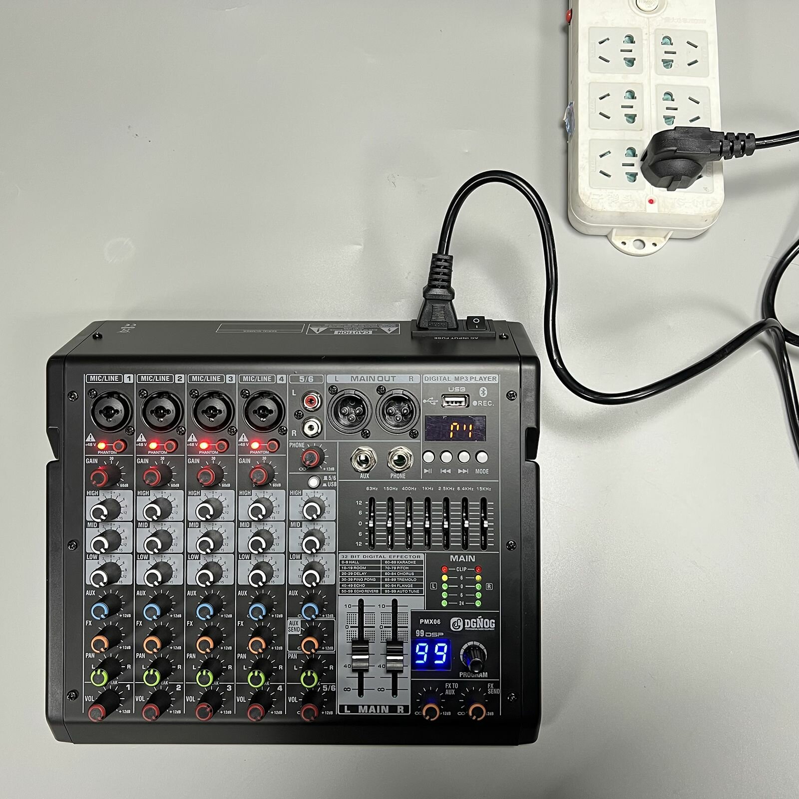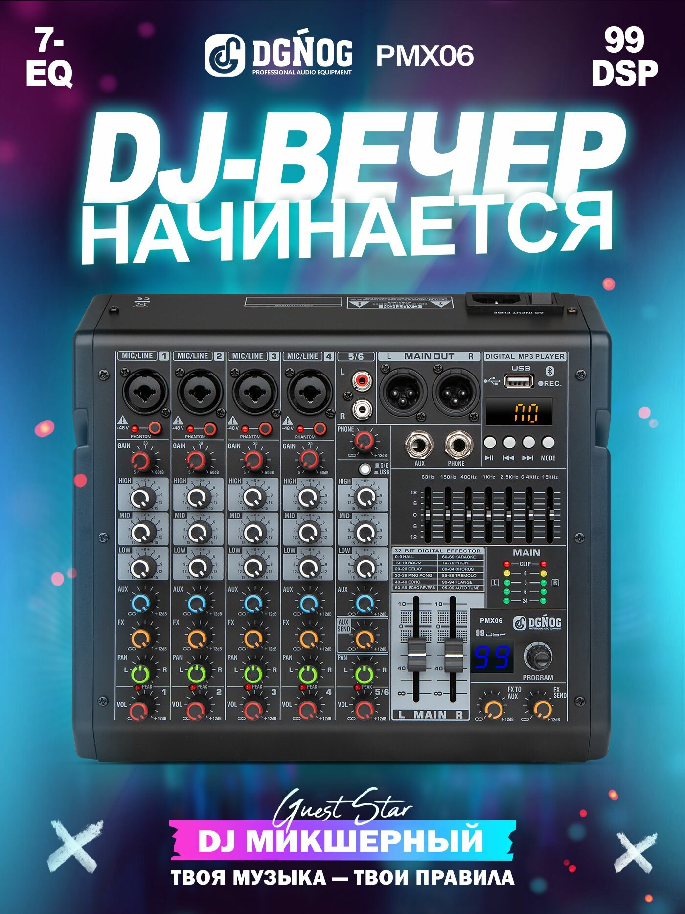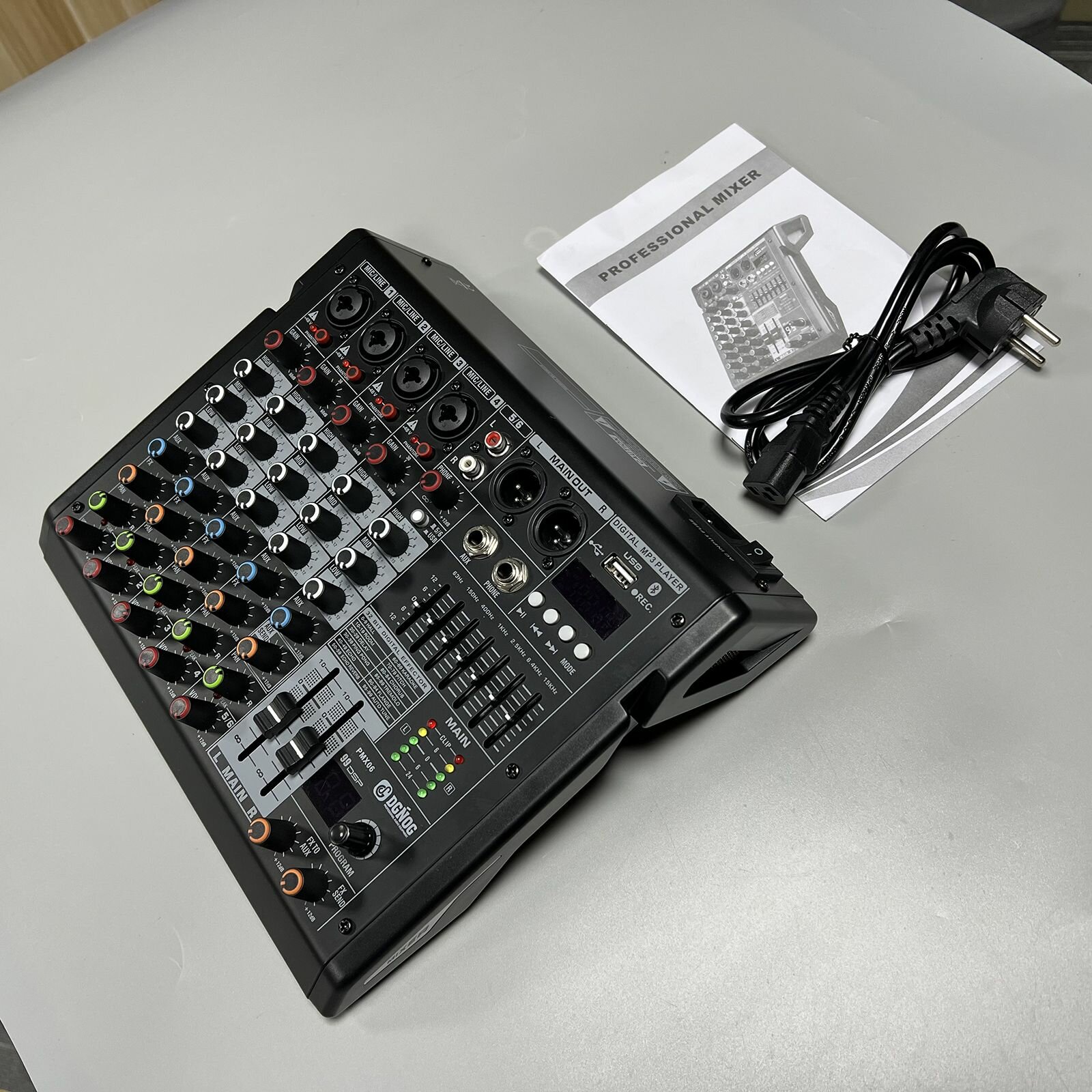 【DGNOG PMX06 Микшерный пульт】 - это очень удобный в использовании 6-канальный Микшерный пульт. PMX06 оснащен всеми необходимыми функциями Микшерный пульт. Встроенный звуковой процессор с эффектом 99DSP, встроенный MP3-плеер, поддержка различных музыкальных форматов, светодиодный индикатор состояния воспроизведения, 7-полосный ультрамузыкальный эквалайзер, линейный пиковый микрофонный вход для всех каналов, светодиодный индикатор, высокоточный индикатор уровня для всех каналов, герметичный переключатель фантомного питания (+48в) кнопочное управление.