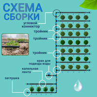 В комплект системы капельного полива входят все необходимые материалы для установки и использования: капельная лента, кран для подвода воды с заглушкой, слепая лента, угловые и тройные коннекторы, заглушки и ремонтный фитинг с зажимом.