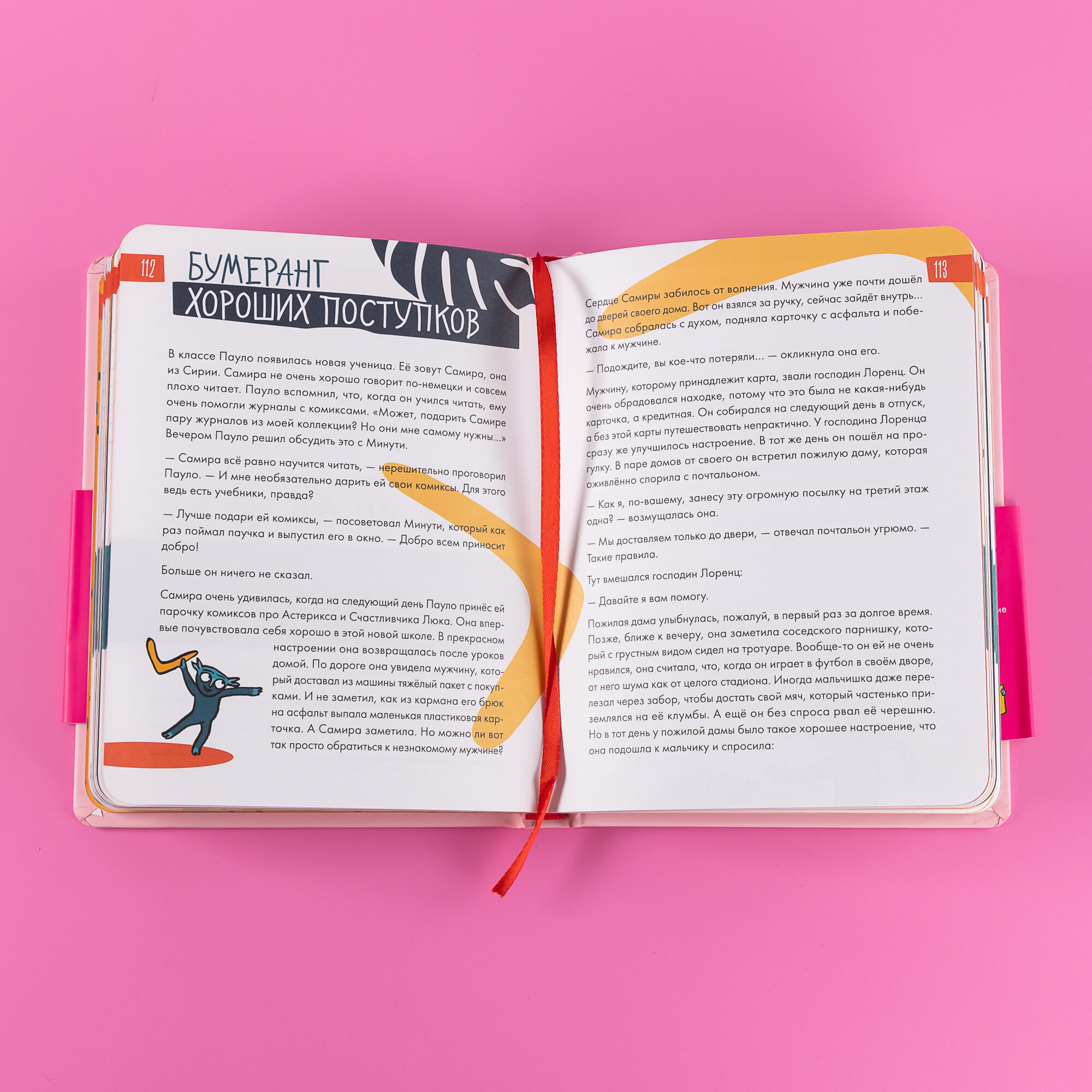 Ежедневник учитывает особенности возрастной психологии детей, поэтому информация подается в игровом формате: заполнение дневниковых записей чередуется с рисованием, ответами на вопросы, интересными фактами и полезной информацией из области психологии. Чтобы ребенку было легче воспринимать материал, на протяжении всего ежедневника его будут сопровождать два героя: мальчик Паоло и его воображаемый друг, проказник Минути.