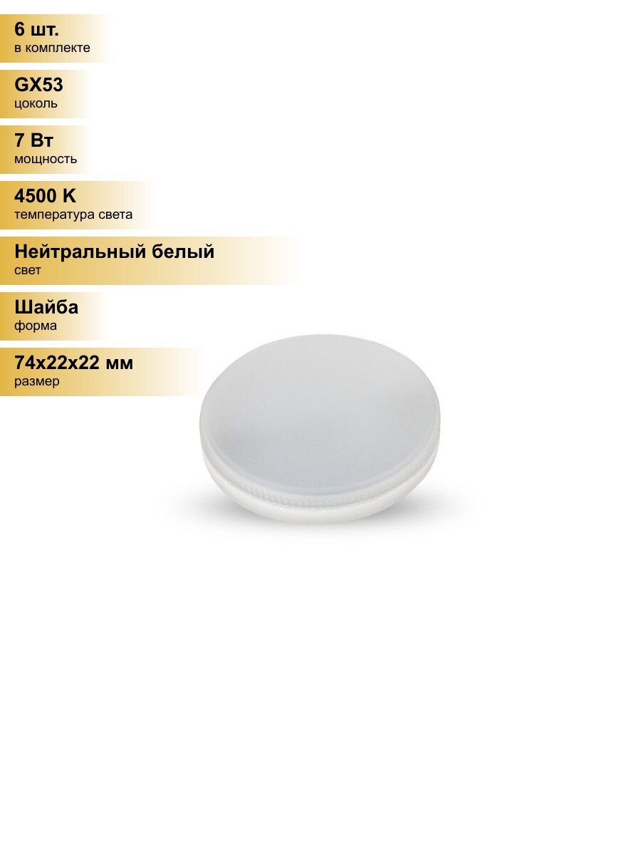 (6 шт.) Светодиодная лампочка Ergolux GX53 св/д 7W(540lm) 4500K 4К матовая 74х22 пластик/алюм. LED-GX53-7W-GX53-4K Нейтральный белый. Цоколь GX53: сравнение цен, характеристики, фото, актуальное наличие и цены.