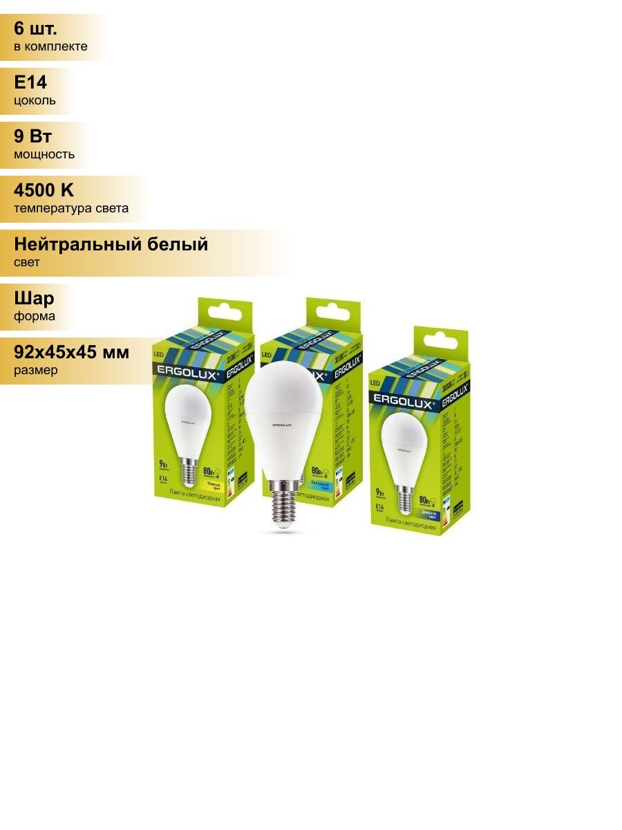 (6 шт.) Светодиодная лампочка Ergolux шар G45 E14 9W(780lm 220°) 4500K 4K матовая 92×45 пластик/алюм. LED-G45-9W-E14-4K Нейтральный белый. Цоколь E14: сравнение цен, характеристики, фото, актуальное наличие и цены.