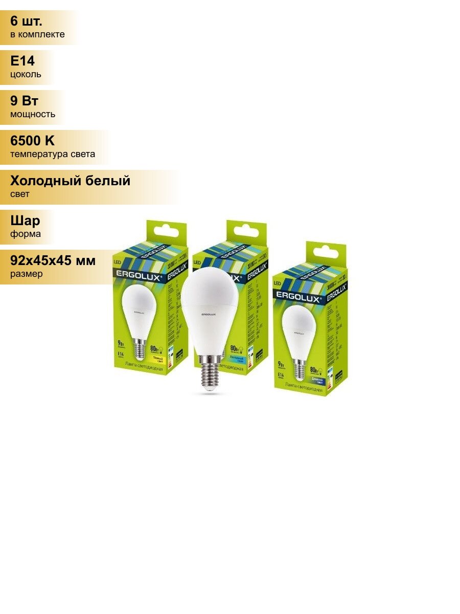 (6 шт.) Светодиодная лампочка Ergolux шар G45 E14 9W(800lm 220°) 6500K 6K матовая 92×45 пластик/алюм. LED-G45-9W-E14-6K Холодный белый. Цоколь E14: сравнение цен, характеристики, фото, актуальное наличие и цены.
