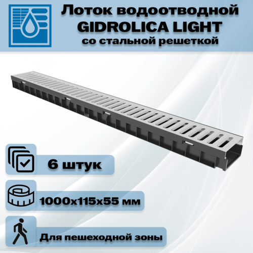 6 штук лоток водоотводный 1000х115х55 мм Gidrolica Light с оцинкованной щелевой решеткой DN100 (А15), артикул 080096, черный: сравнение цен, характеристики, фото, актуальное наличие и цены.