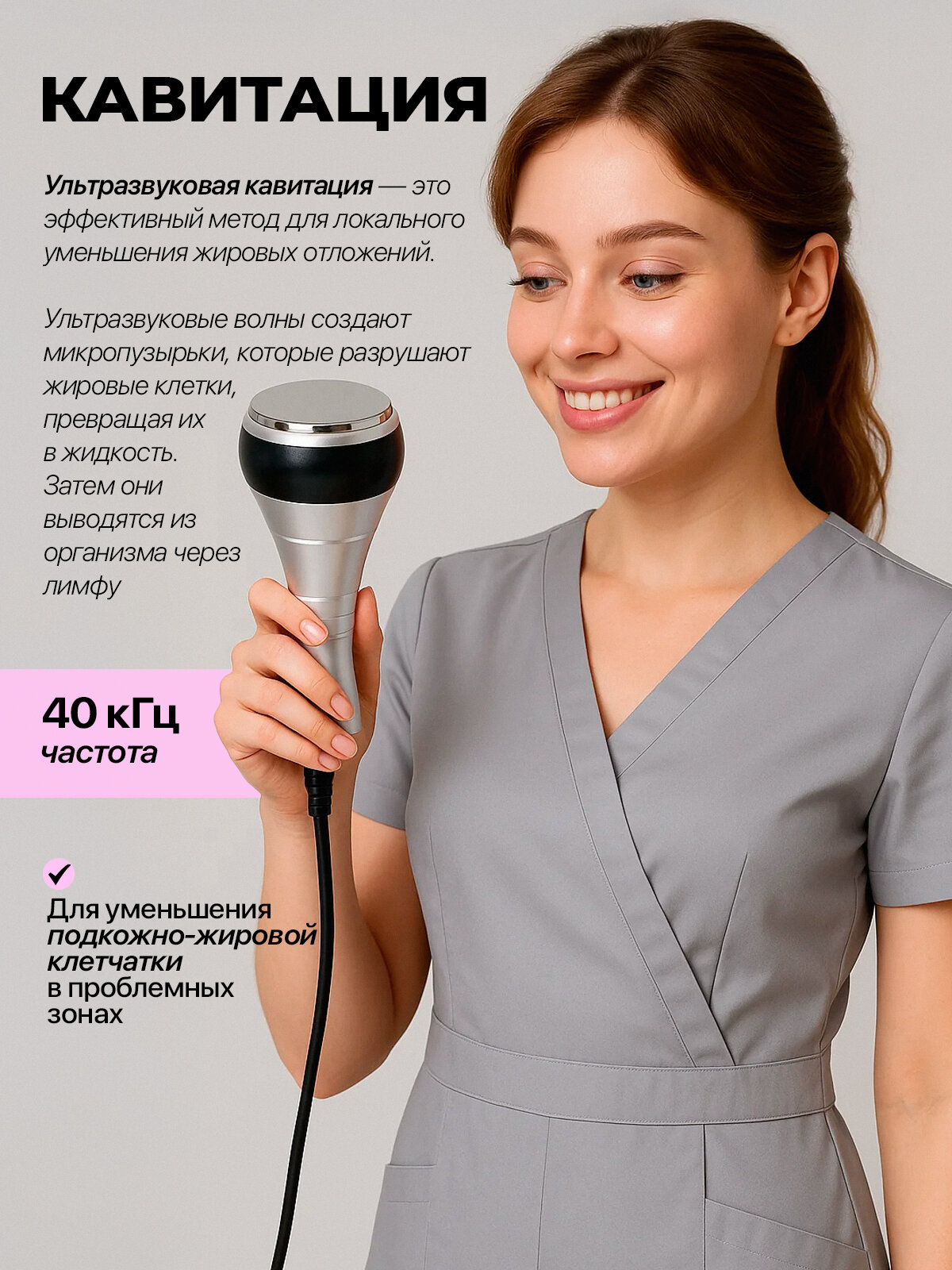 Инновационный косметологический аппарат для комплексного ухода за лицом и телом: лифтинг, прогрев, разглаживание морщин, антицеллюлитный эффект, лимфодренаж, ультразвуковая кавитация и массаж. Питание от сети 220В.