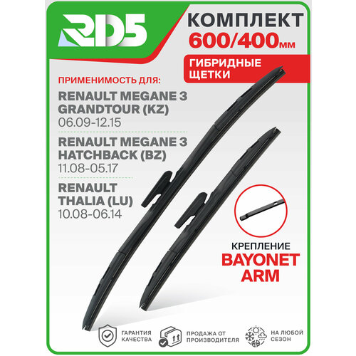 600 400 мм. Крепление bayonetarm. Комплект гибридных щеток стеклоочистителя RD5 дворники на Renault Megane III Grandtour; Рено Меган 3 Грандтур; Renault Megane III Hatchback; Рено Меган 3 Хэтчбек; Renault Thalia; Рено Тхалиа