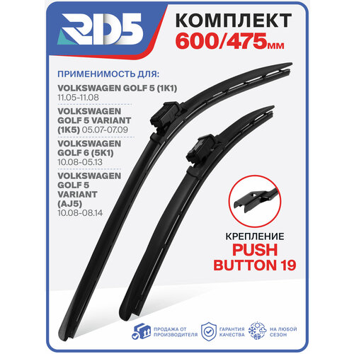 Купить 600 475 мм. Крепление push button 19. Комплект бескаркасных щеток стеклоочистителя RD5 дворники на Volkswagen Golf V; Фольксваген Гольф 5; Volkswagen Golf V Variant; Гольф 5 Вариант; Volkswagen Golf VI; Гольф 6; Volkswagen Golf 5 Variant; Гольф 5 Вариант с доставкой по всей России.